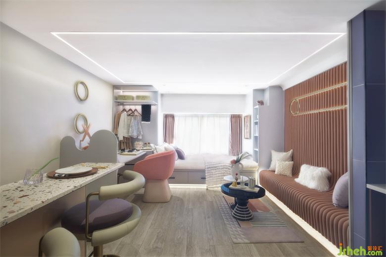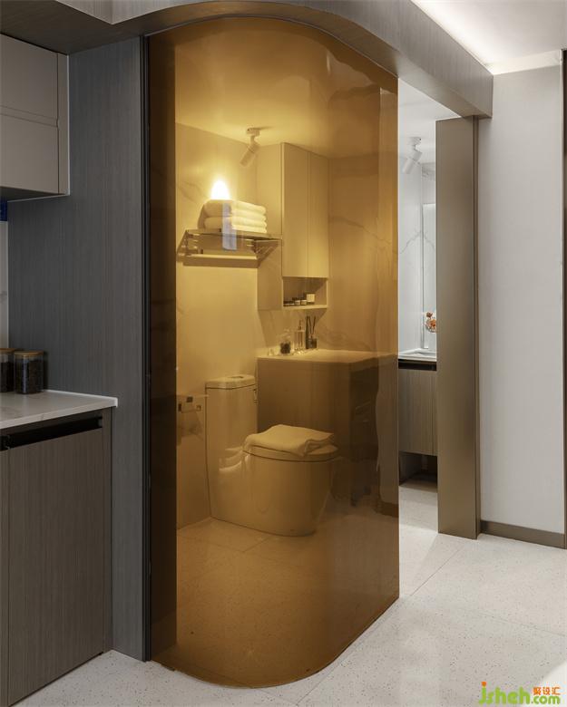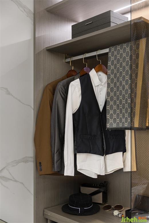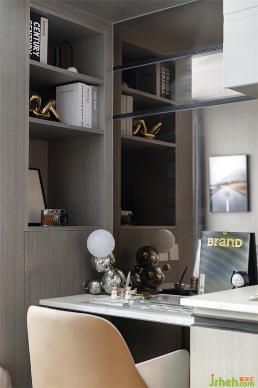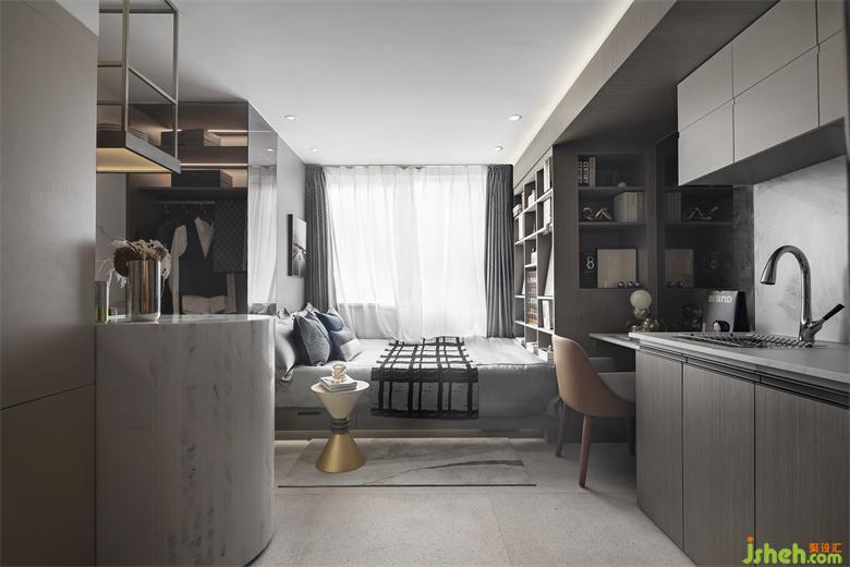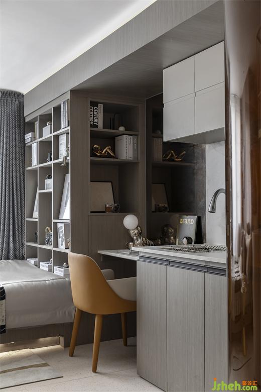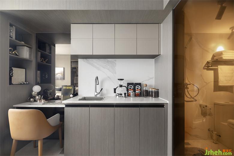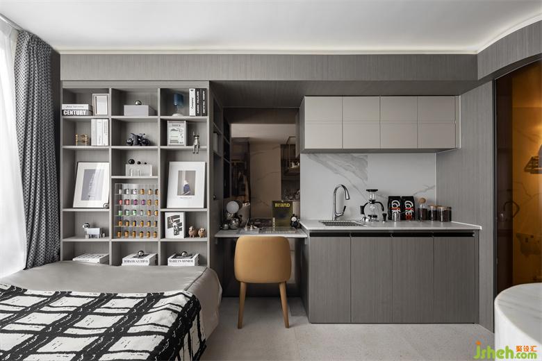 入口廊道处对整个空间布局一览而进,雅白和浅咖色调彰显出空间时尚优雅的特点。样板房设计床品采用亲肤质地的材质,为主人公打造一个舒适的睡眠环境……衣柜内陈列了主人公高品位的服装、眼镜、手提包等,床边利用小边几打造一个休闲氛围,吧台区域利用空间做二层金属收纳平台,满足生活必需品的摆放和收纳,使空间时尚沉稳中增添秩序感。卫生间采用弧形角度,茶色弧形玻璃隔断在满足私密性的同时,使得线路流动空间更流畅。厨房以咖啡为主题,我们加以咖啡机、咖啡壶等饰品烘托氛围,弥漫咖啡香气,扫走一天的疲惫……书桌区以摄影为主题,木质肌理饰面板做展示柜,为居住者带去多样的生活体验感,摆放摄影作品和相机,采用了设计感极强的书椅及台灯来衬托主人公艺术品味....主人公业余喜欢交流摄影技巧和赏析摄影作品,喜欢与更多的摄影爱好者一同分享摄影的魅力!把日常生活中稍纵即逝的平凡事物转化为不朽的视觉图像。摄影就是记录,只要是热爱生活,就可以找到“真爱”....