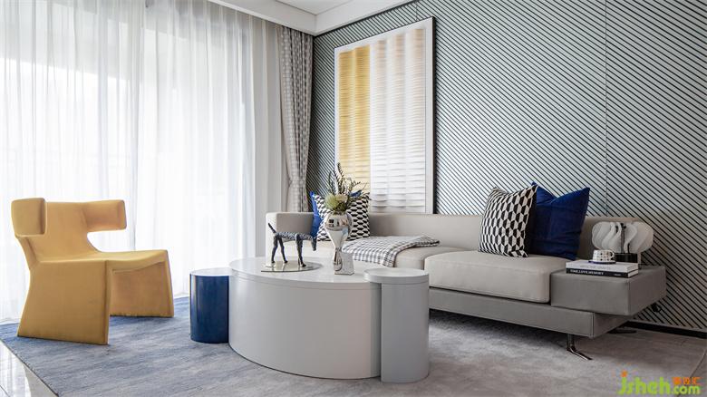 艺术造型的茶几、芥末黄色的单人沙发、几何元素的抱枕、线条背景墙、湖水般蓝色的地毯将这些元素柔和在同一个画面里,客厅舒适又和谐。