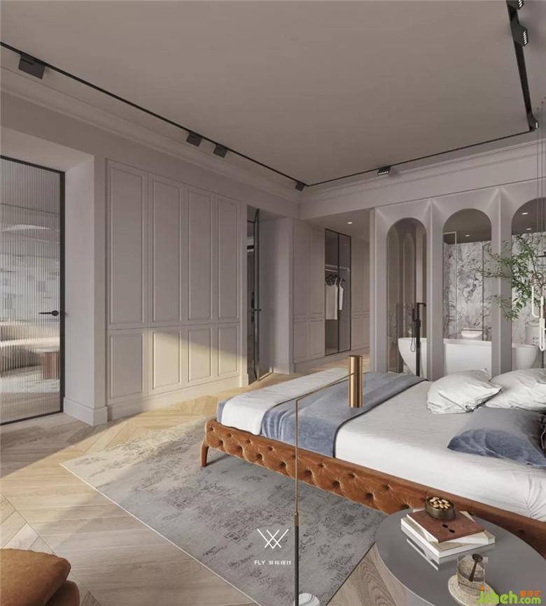 主卧的空间很大,宽敞明亮,有一种多层次空间的自由感。同色系的床体和躺椅交相呼应,让人能够在这个空间里有效地释放出瞌睡因子,能够得到良好的休息。线条感设计的吊灯,蓝色的艺术设计让整个空间层次更加丰富,而弧形门洞的设计更是让空间隔而不断。