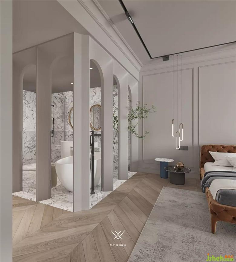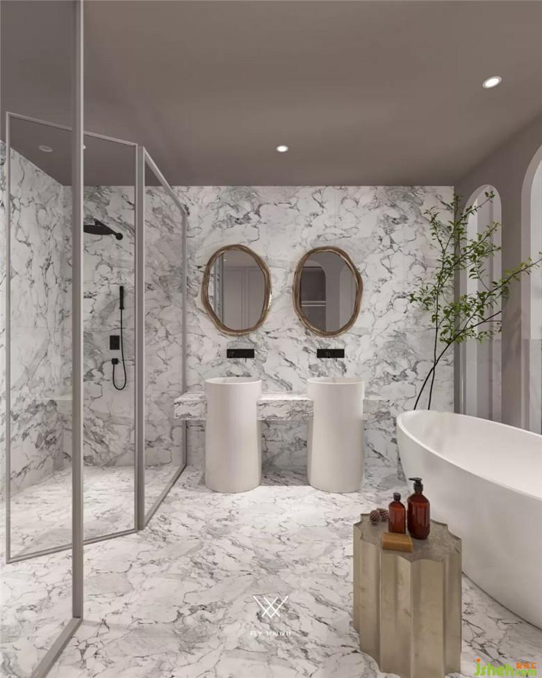 我们有在很多地方设计弧形门洞,卫生间的这部分就能很好看见建筑设计的影子。