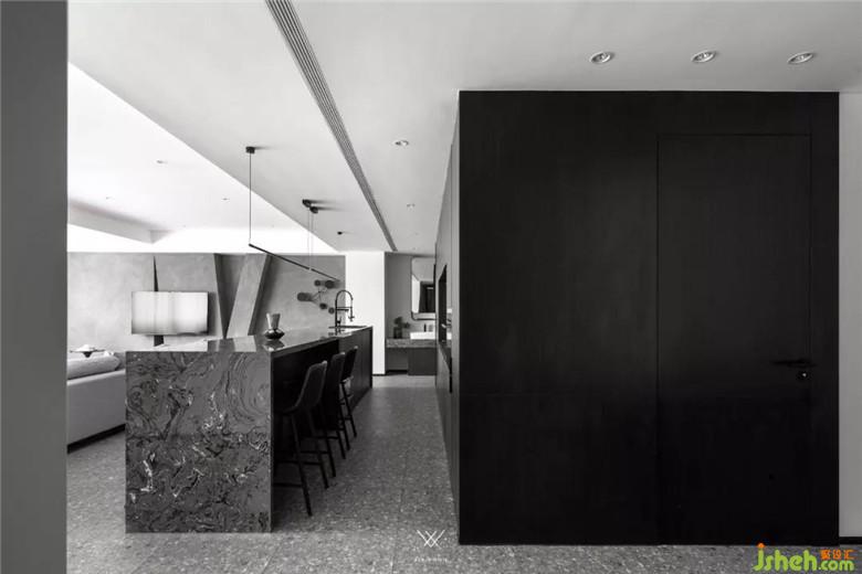吧台式的餐厅与客厅相邻,铺之以开放式的西厨空间,可以拉近居住者们的距离。水磨石的地面、极简的餐桌造型,都流露出最质朴的魅力。