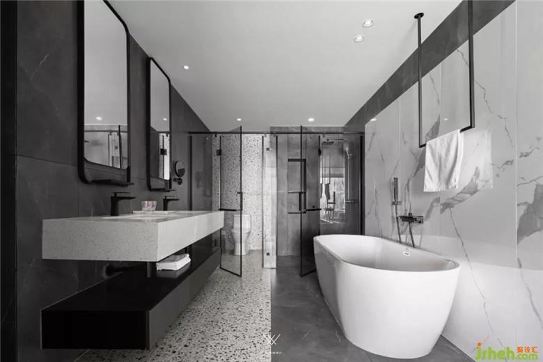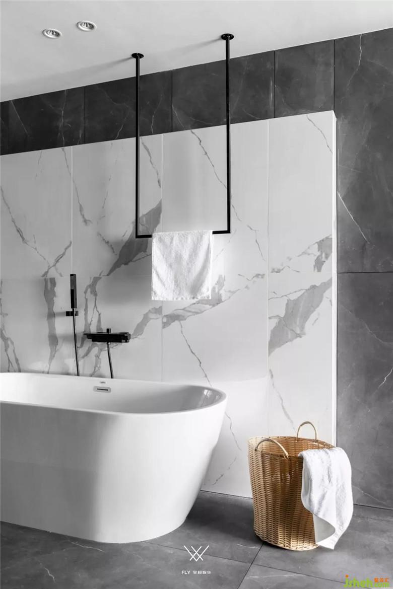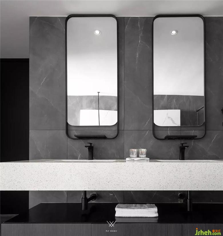 主卫采用黑白灰的极简配色,给人整洁规则的感官体验。毛巾架、镜子、门框,都采用了较为棱角感的线条设计,水磨石和鱼肚白砖的搭配,更使得整体效果显得很有“脾气”,仿佛不被世俗磨圆棱角。