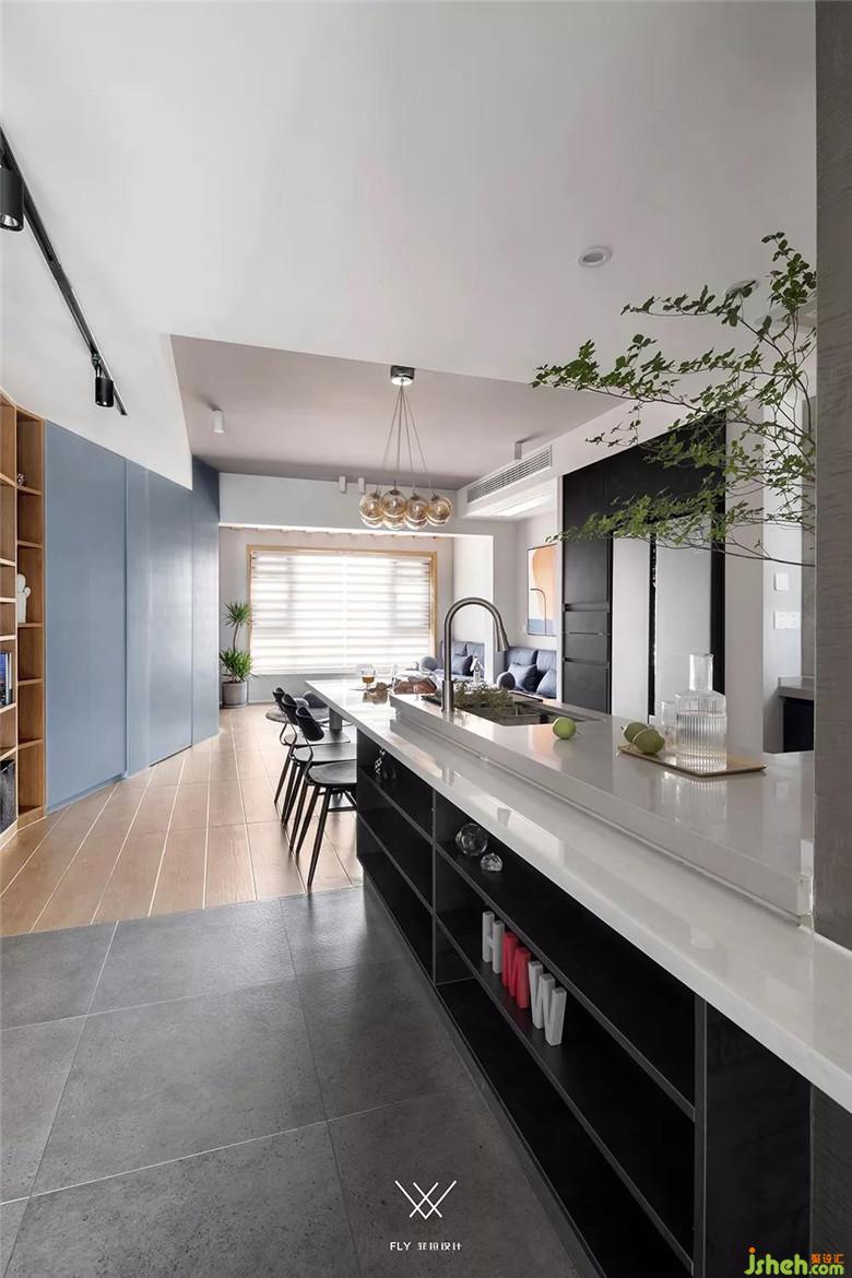客餐厅地板选用木质纹理的地砖,既有木质的温馨感又易于打理。顶部的灰从色彩上优化空间层次,巧妙生成与厨房的区隔。装修公司将阳台纳入客厅扩展公共空间,满足业主想要的多一些孩子的活动空间和互动空间的同时,提升空间的体量感。