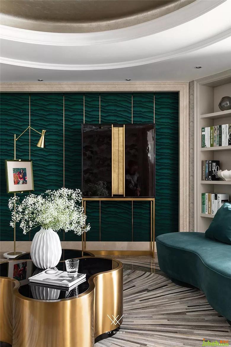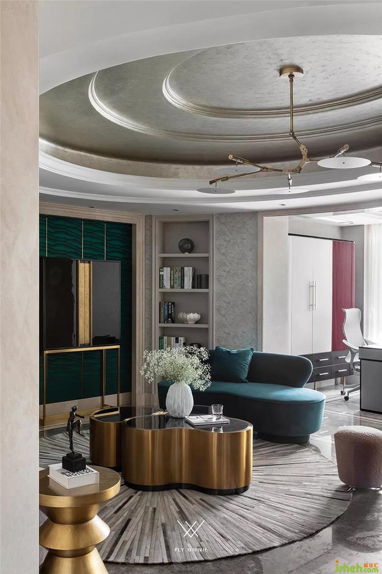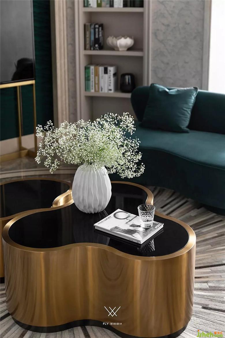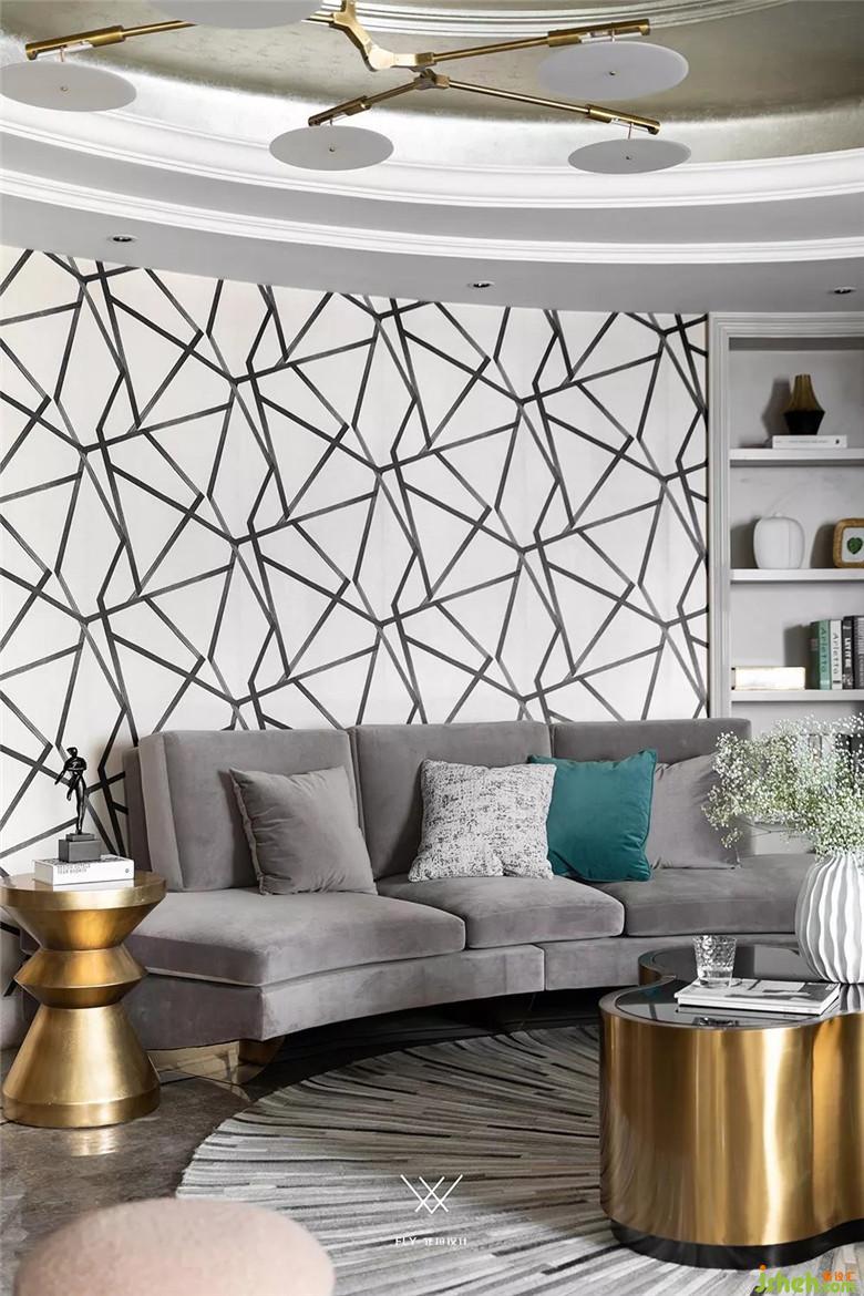 家具参考纽约时尚都市的轻奢气质,选择了绒布质感的两款弧形沙发互相呼应、金属材质的茶几和边几、马毛放射状圆地毯。背景墙摆放了酒柜形式的储物装饰柜,周围的饰品选择GLOBAL VIEW的进口花器和果盘,兼具观赏性和实用性。