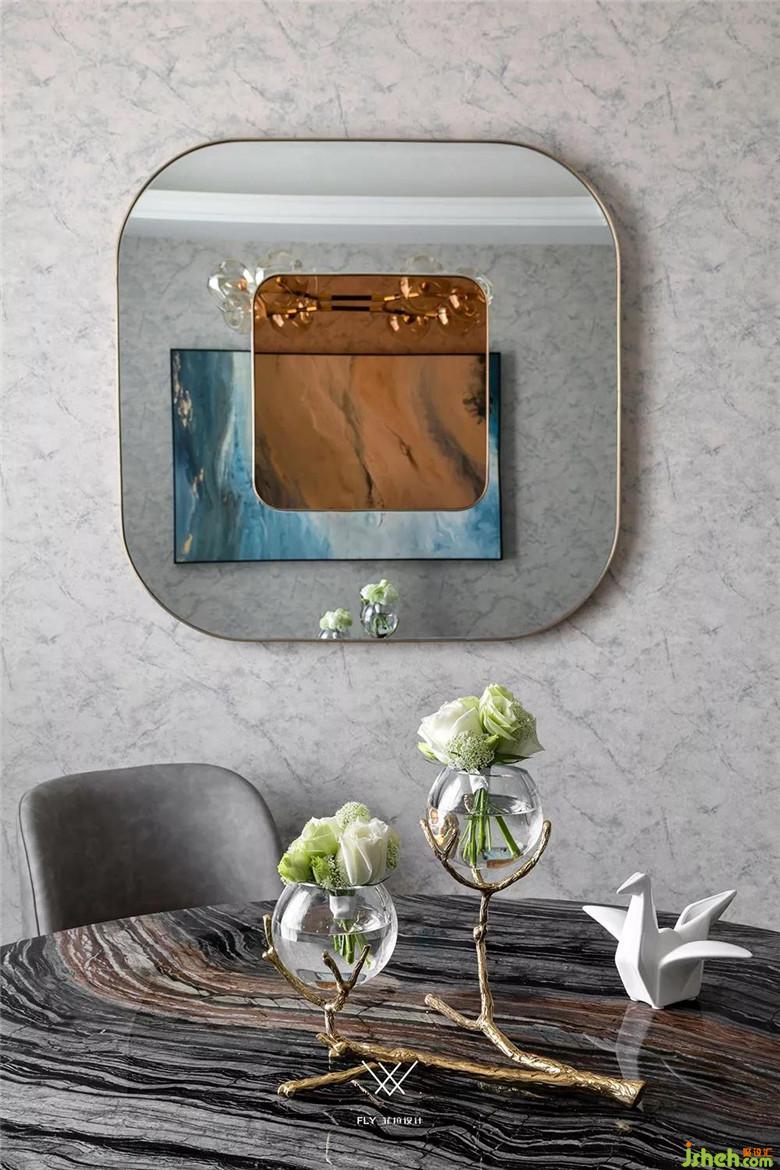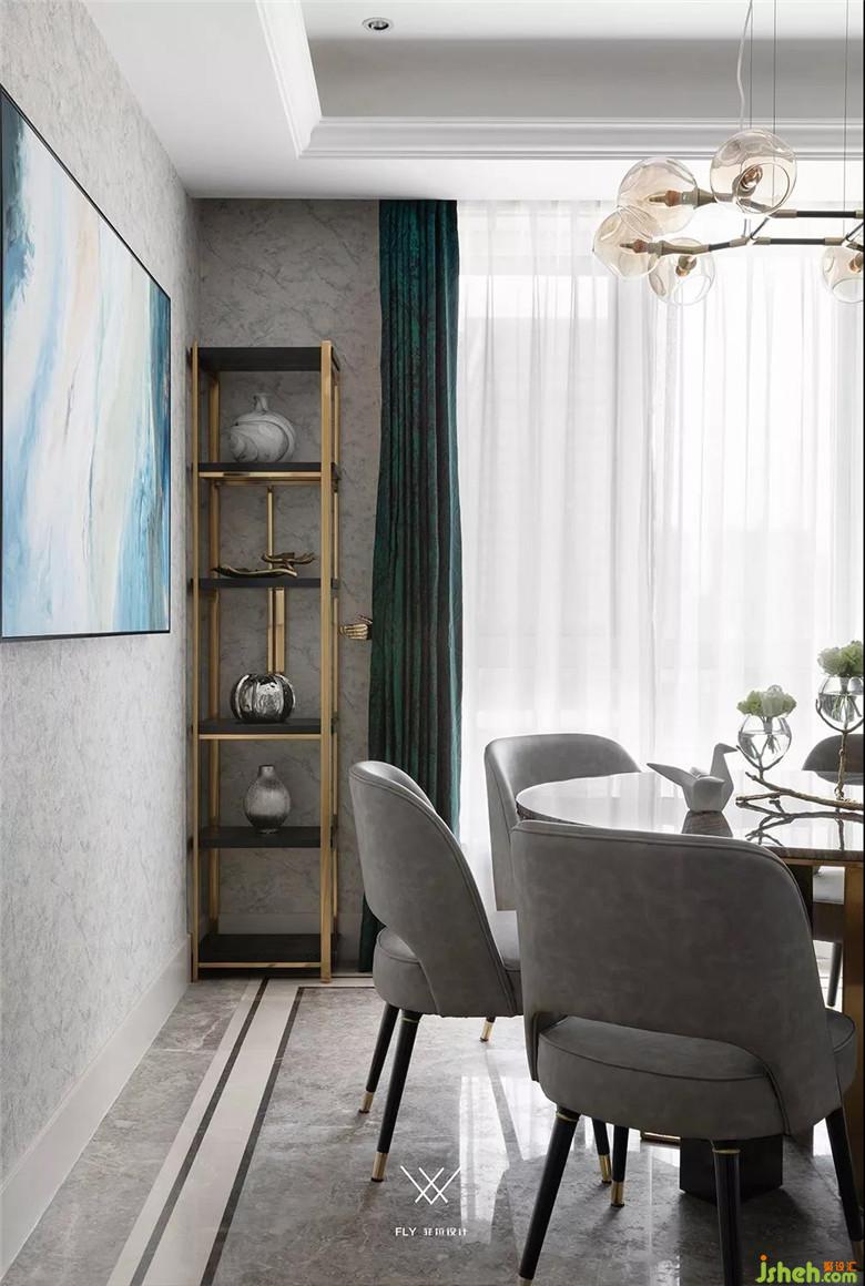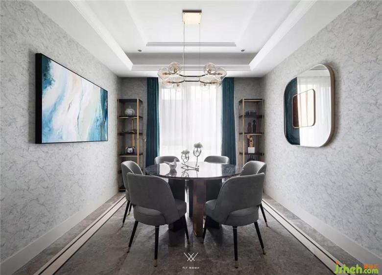 圆形餐桌的形式,两侧墙面的装饰挂镜和挂画,打破餐厅原本比较闷的墙面环境。细节上依旧延续轻奢气质,窗帘延续客厅的墨绿色。 共4页: 上一页1234下一页