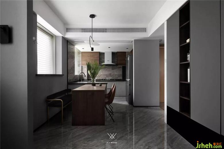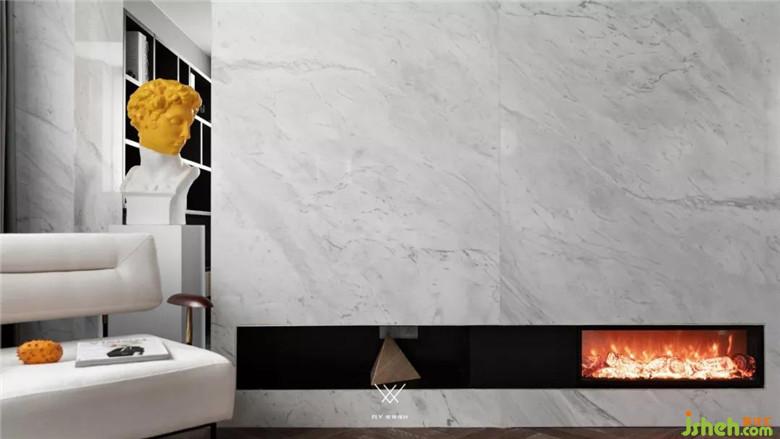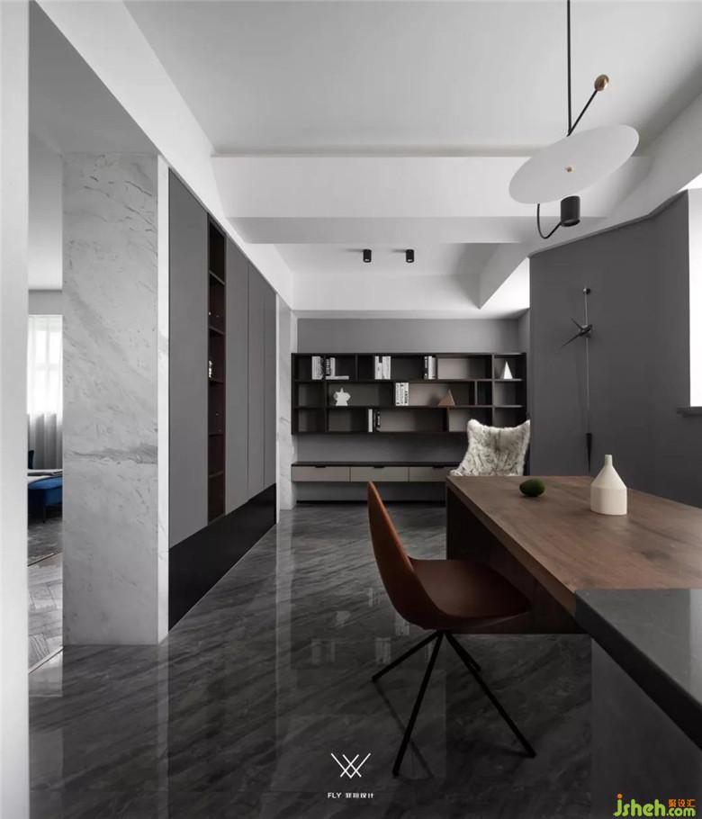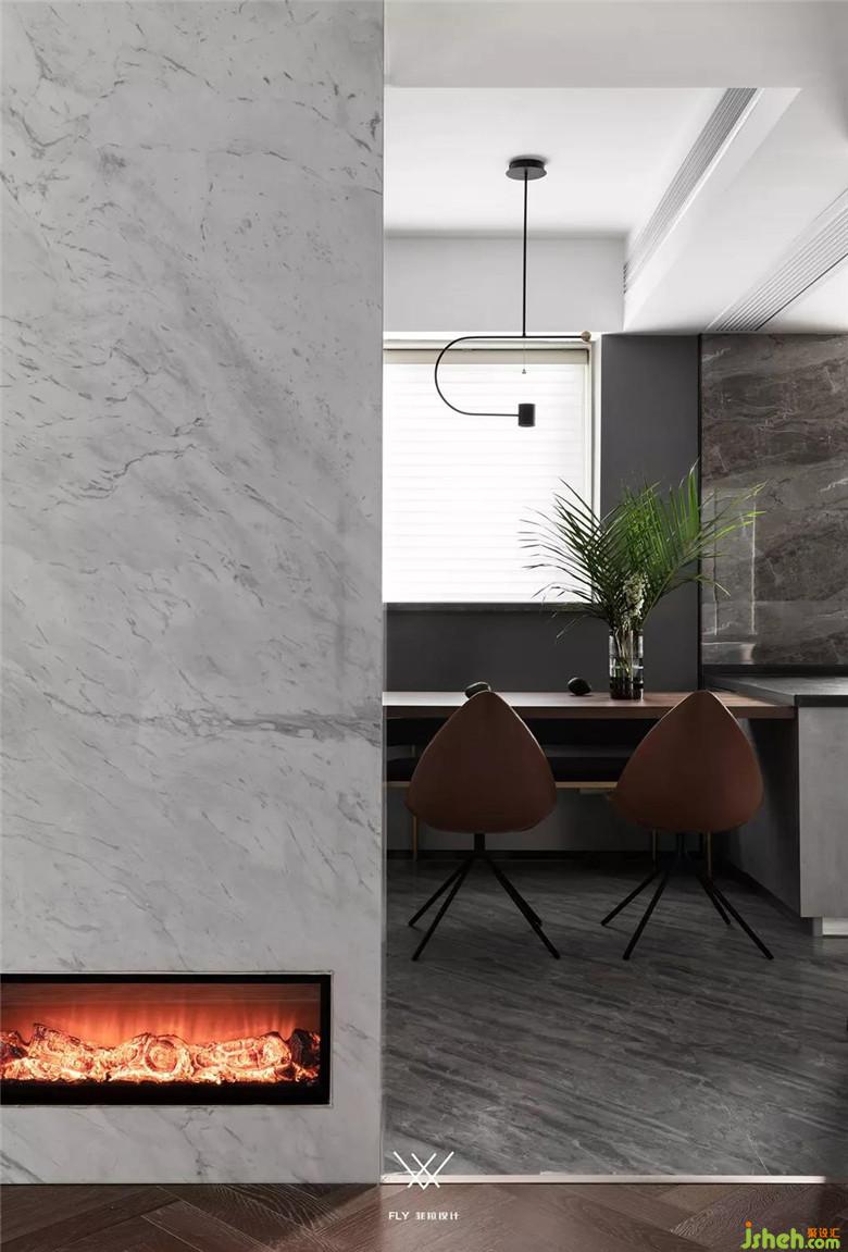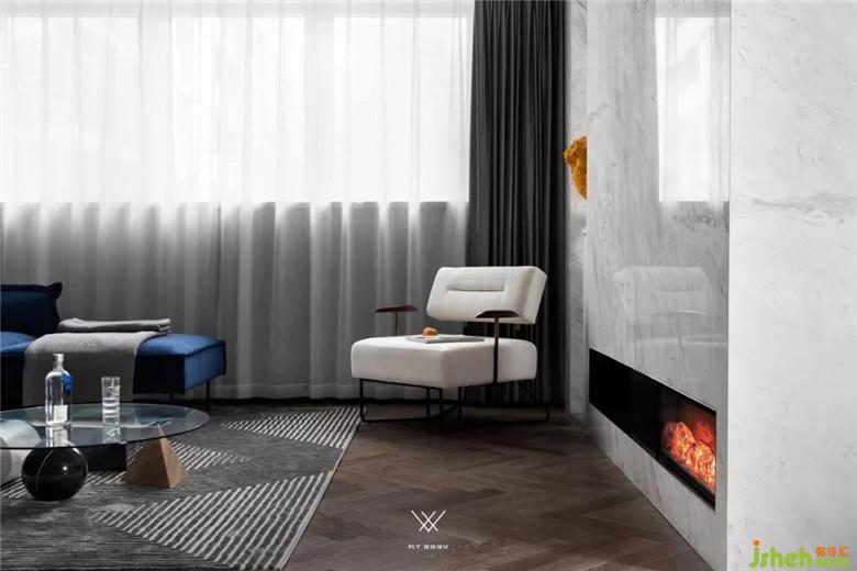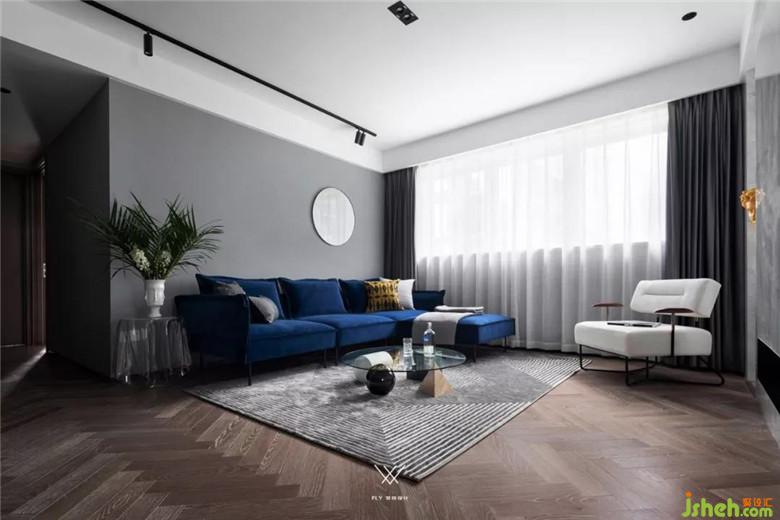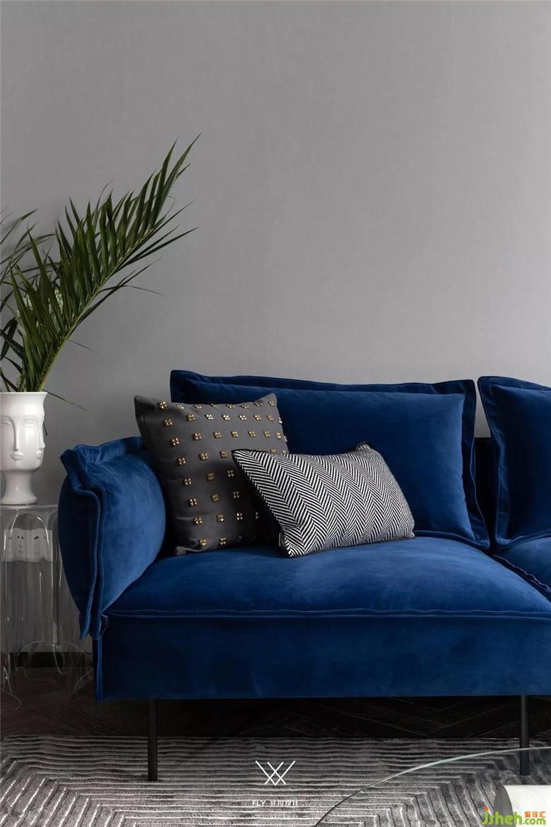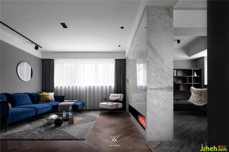 以大面积的暗灰色系为基础色,通过不同程度和温度的灰加强空间的质感,带动整个空间格调。爵士白的大理石背景墙提升空间亮度,做到明暗有度。沙发的深海蔚蓝给空间注入更多的充实感和能量感,仿佛是缥缈星球中的一片湖海,鲜活而有生机。