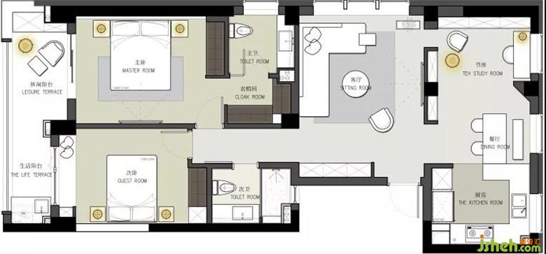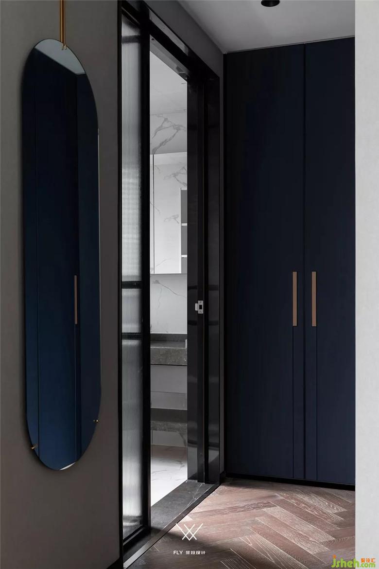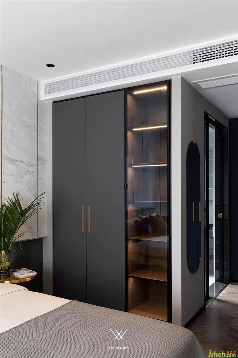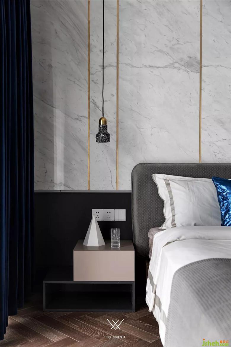 由于业主对大理石的偏爱,将之用于主卧背景墙进行整铺。避免过于呆板,在不同比例的块面上嵌入铜条,金属元素提升空间的精致,线条拉伸空间线条比例。