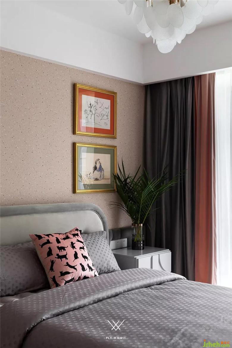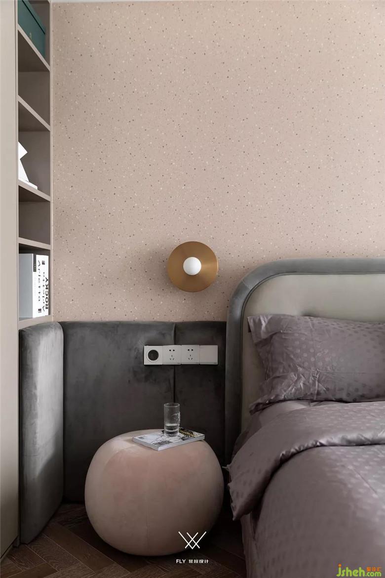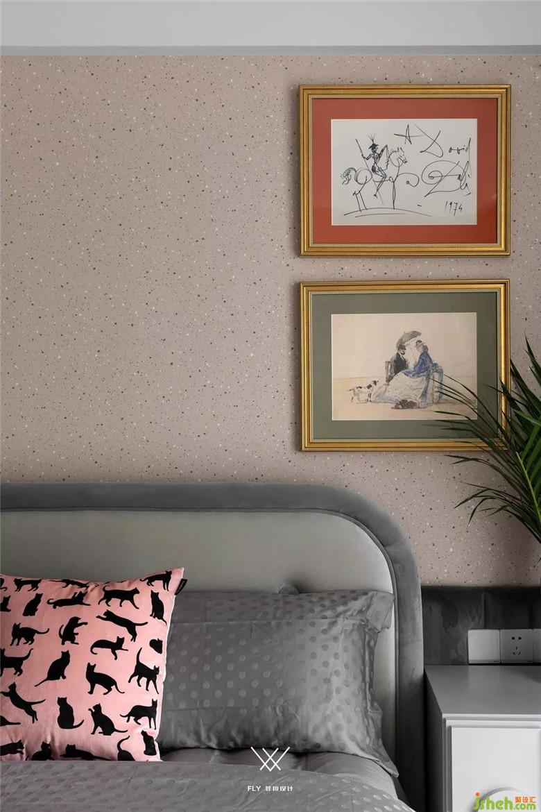 满足业主女儿想要的甜美,壁纸挑选带有水磨石纹理的灰粉色,以粉色展现女孩的温柔,注入灰色调和粉色带来的黏腻感,甜而不腻,满足少女心的同时和整个空间的基调保持一致。床品的选择加入少女感的波普风,洋溢着女孩子的活泼俏皮。