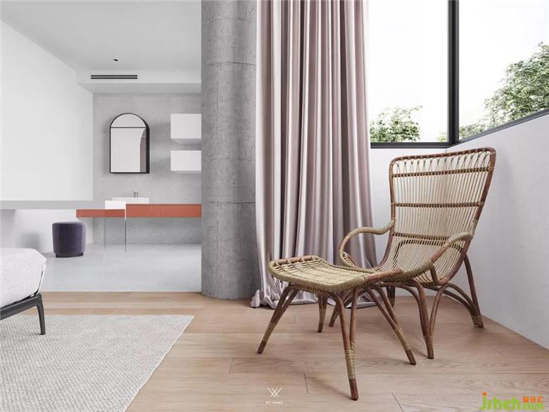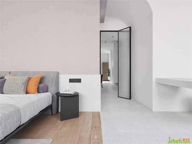 走道半圆弧造型与原来房屋的大梁结合,用不同材质介定,突破原结构限制,让空间充满艺术感和张力。