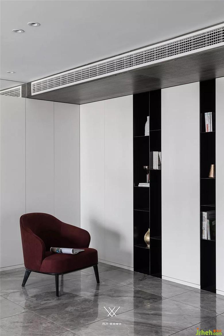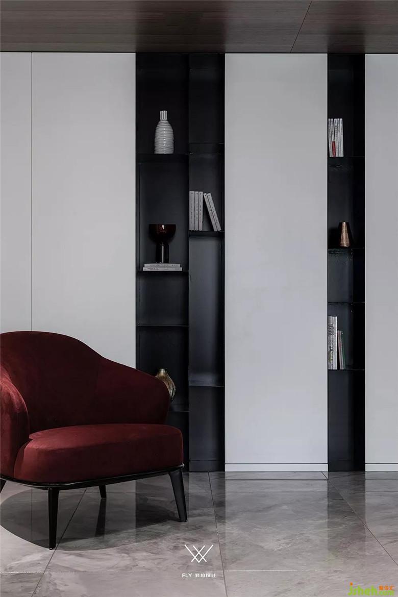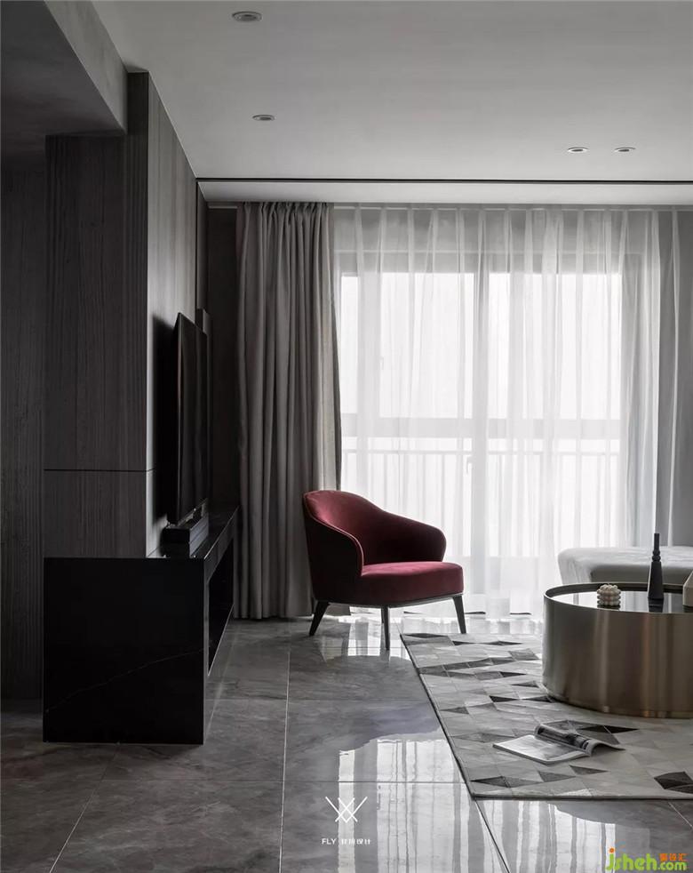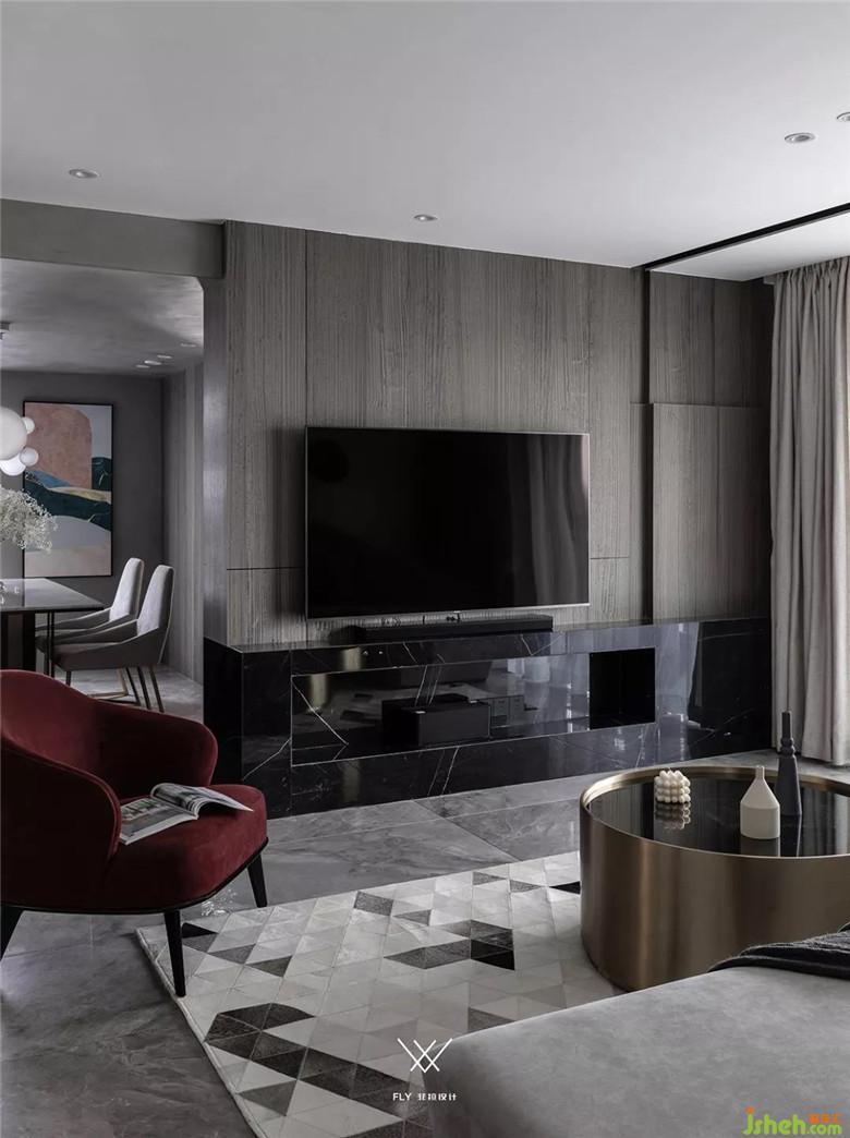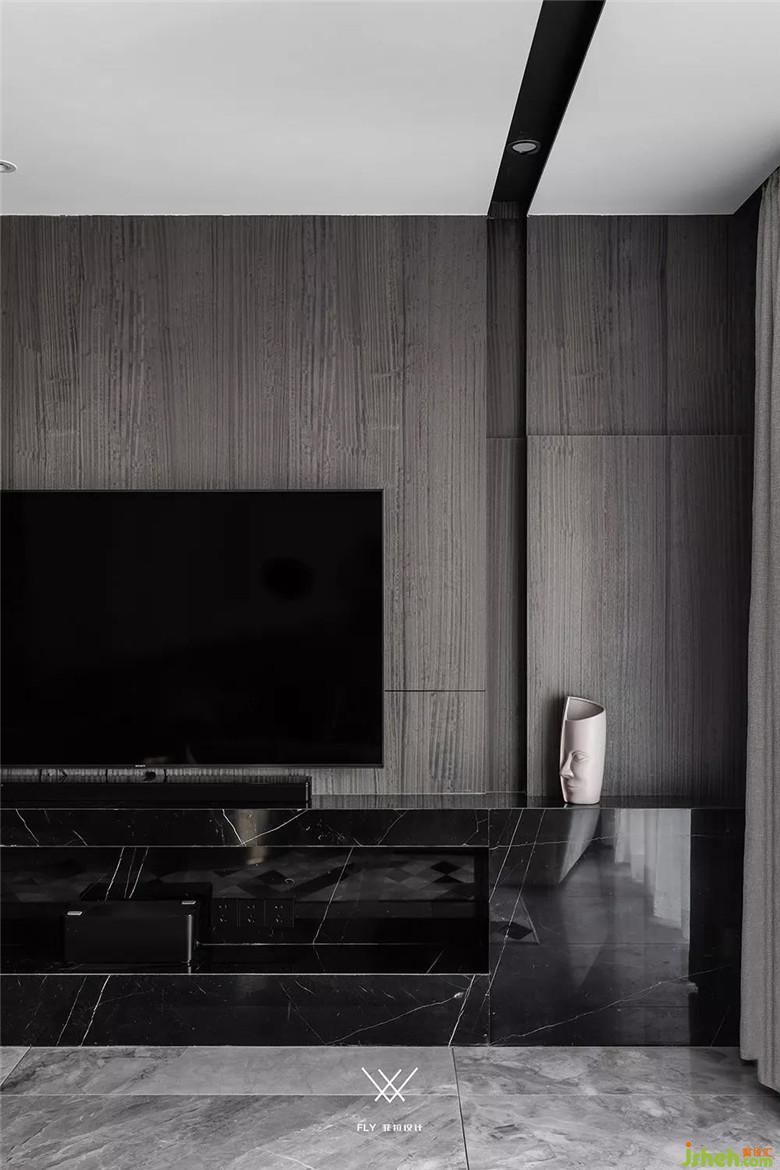 如果看设计图的话能够看到电视机在背景墙的三分之一处。主要原因是沙发背景墙和电视背景墙长度不一样,放在这个位置能够让电视的中轴线和沙发中心相同,看电视更舒服。电视背景右边多余的部分用凹槽加上高低不平的块面去处理,让这部分不会显的突兀。