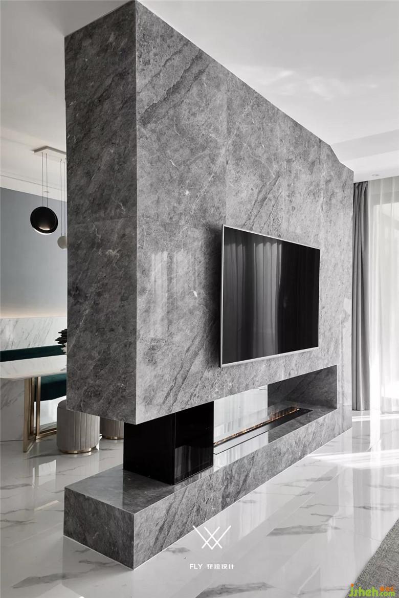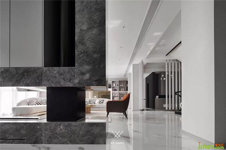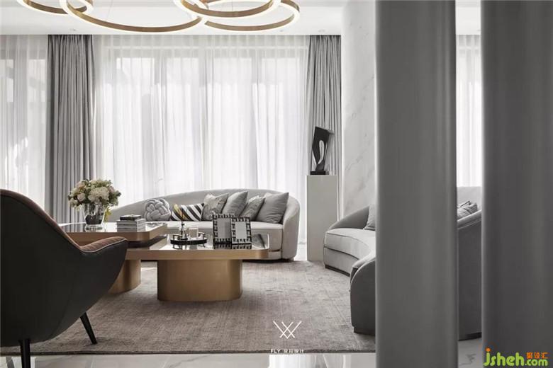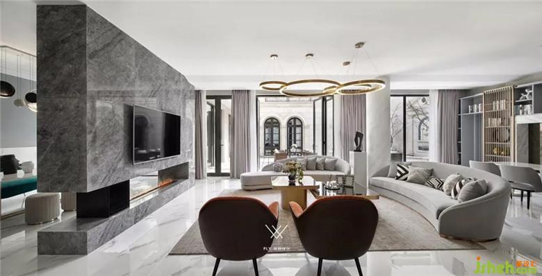 本案定义为现代轻奢风,现代轻奢是将材料、色彩、灯光及元素进行简化,以实用的功能性家具为主,用简洁的视觉效果营造出时尚前卫的家居氛围,用优雅低调最受青睐的高级灰把持全局,使得整体空间显得高雅、深邃、宁静、性感。中性而又低奢的黄铜拉丝材质一直伴随着主旋律而存在,大面积的高级灰会稍显缺乏生活气息,所以在不同的空间中设计师加入了不同的亮色来点缀,在拉开空间层次感的同时赋予了每个空间不同的灵魂。