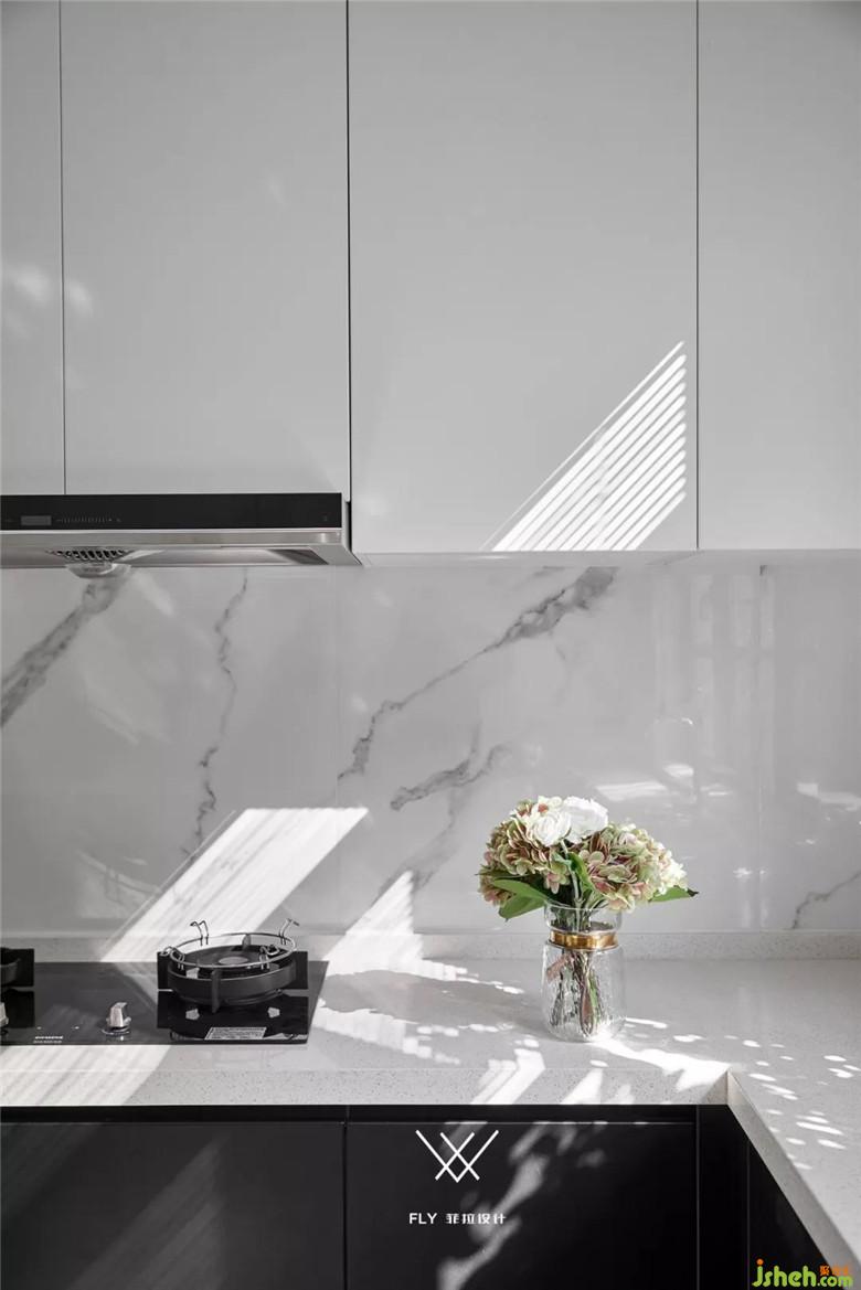 厨房采用中西厨的形式,让两种不同的烹饪方式分离,黑白金的色调搭配让厨房现代感十足的同时又带点小奢华。墨绿色的椅子让空间更加时尚,早餐与简餐在中岛就能解决。