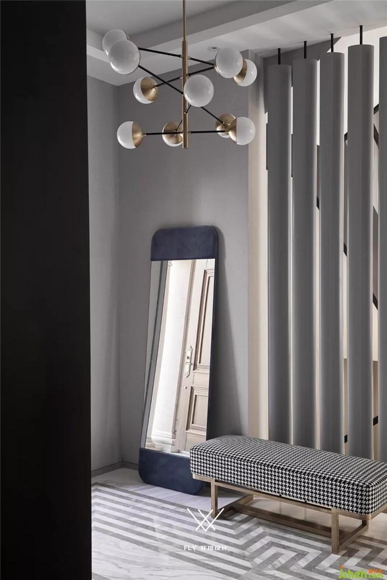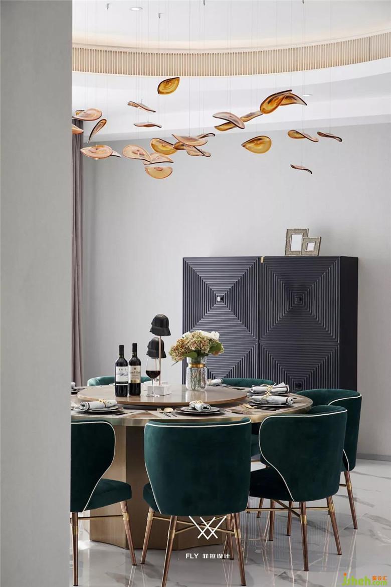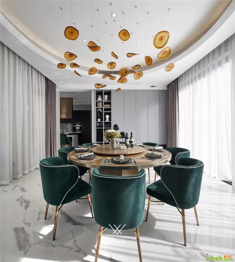 圆形餐桌的设计是有考虑到中国博大精深的饮食文化。在增进食欲和趣味方面设计师也用了一些功力。在秉承整体灰调的基础上订制橘色的半透明琉璃装饰挂件,它能够随着气流而摇晃,让空间变得灵动有生机,桌面采用了黄色的细木纹材质。为了提升空间的时尚感,餐椅则选用了墨绿色的面料,考虑到平时打理方便餐厅大面积的酒柜进行隐藏式设计,仅一小部分敞开用来展示主人的珍藏点缀空间。