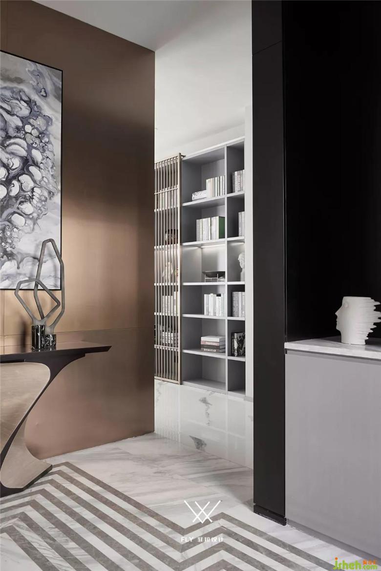 入户后通过可旋转的橄榄形立柱使玄关与客厅浑然一体,利用旋转的立柱可以任意调节玄关与客厅的视角,这既强调了玄关的独立性又能让玄关与内部产生更多的互动,而且增加了虚实相生的趣味性。