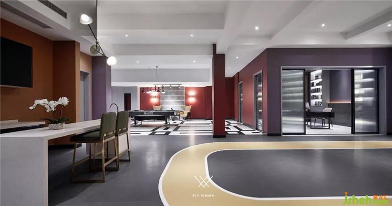 我们只是通过简单的材质来营造空间氛围,墙面是美国进口乳胶漆本杰明,特性是比较防潮耐脏,色彩丰富,能做到低饱和度高明度色彩,地面则用健身房专业地胶板材质铺贴。