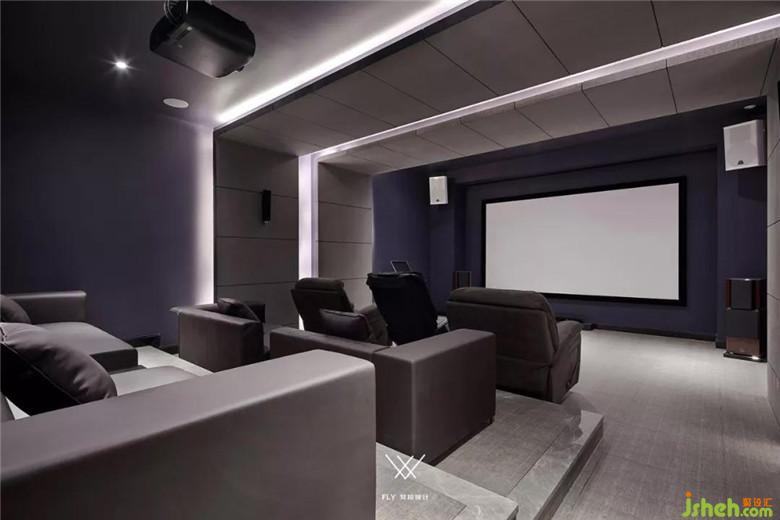 45m2的影音室空间,150寸高清宽幕,能容纳11人观看大片,周末可以约上小朋友来加中看动漫了,影音室有根下挂85公分的横梁和立柱,通过两个U字造型巧妙的将梁柱隐藏在内部,保证楼层高度的同时增加了空间的层次感,影音室运用低饱和度的藏青,可以静静的享受影视的快感。