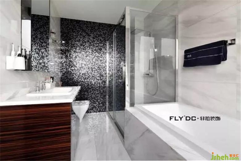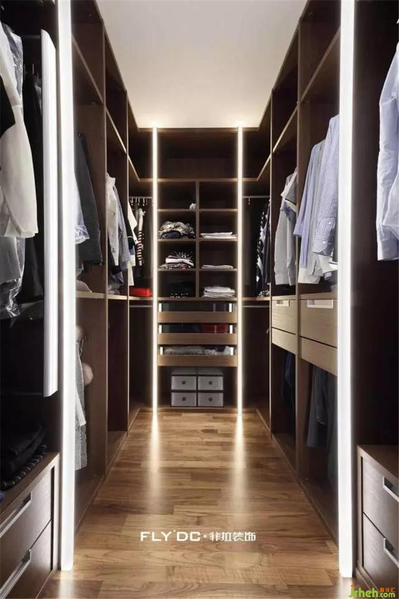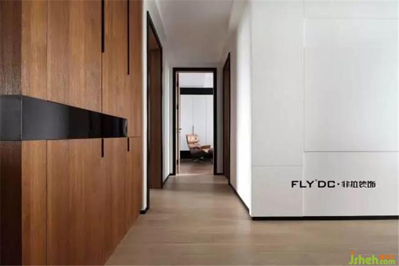 客厅主卧整屋吊顶均采用点光源照明,大体块与线条的结合穿插设计,用色上干脆鲜明,整体以柚木色和白色为主调,黑色局部衬托。