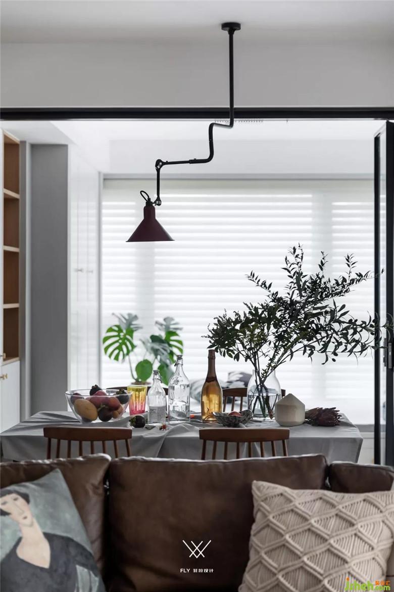 餐厅的灯也是不同于普通的吊灯,而是配合餐桌可调节的可能性,做了可折叠的。