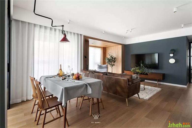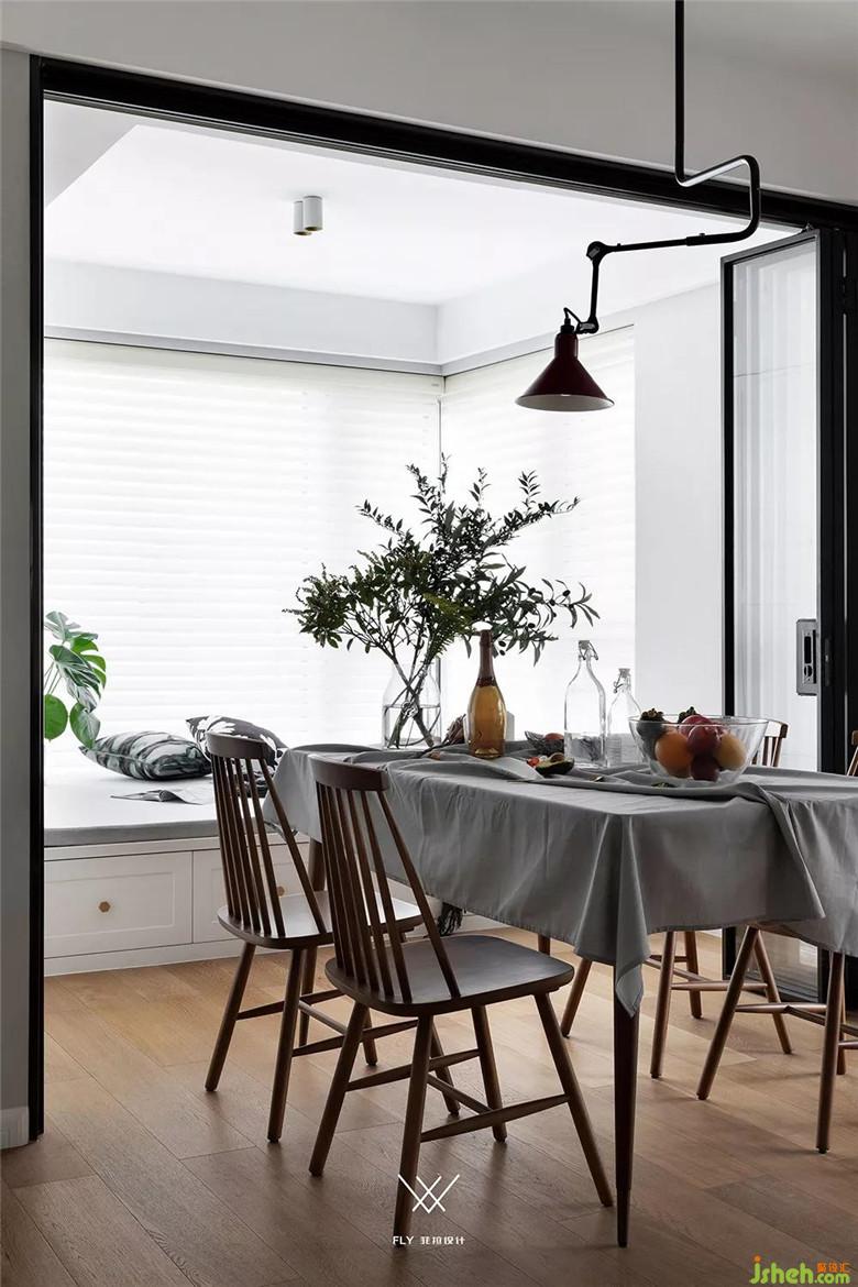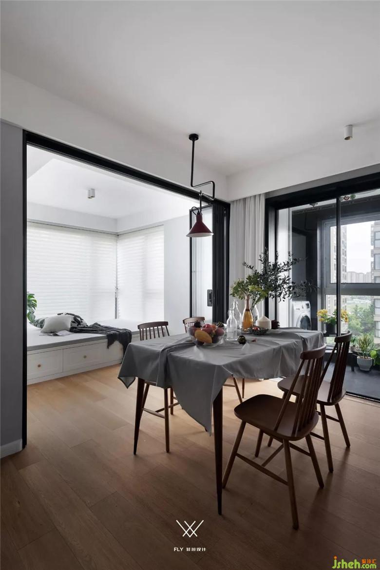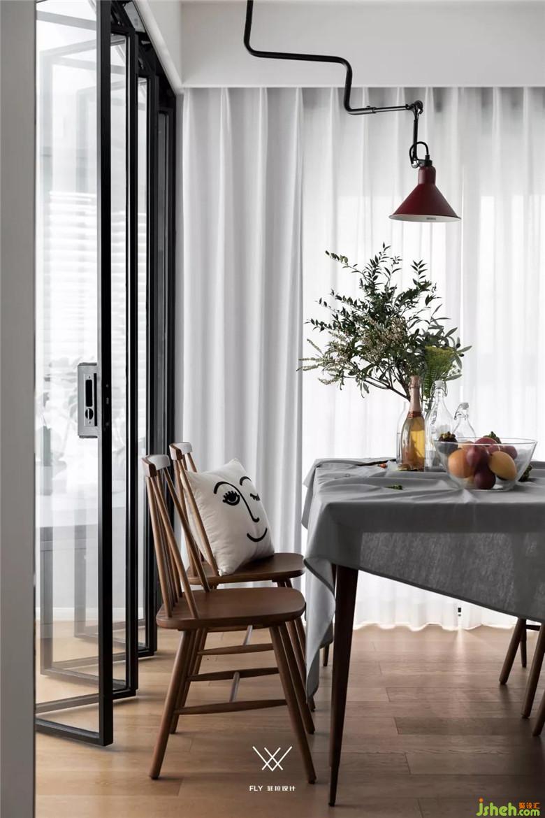 原始餐厅位置刚刚好够用。装修公司把餐厅旁边的多功能区做了整面折叠门,在有朋友来访的时候,餐桌的形式可以变成聚会形式,把多功能区的面积纳入餐厅。