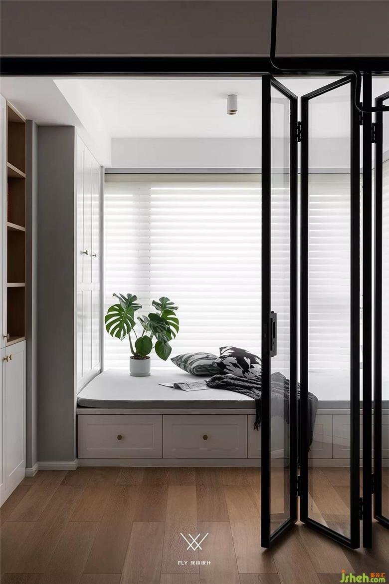 多功能区可开可合,折叠门关上,纱窗拉上的时候,还是一个可以午休和供客人偶住的区域。