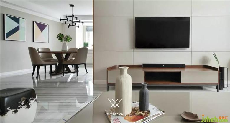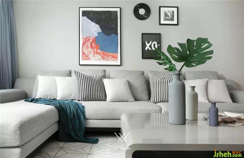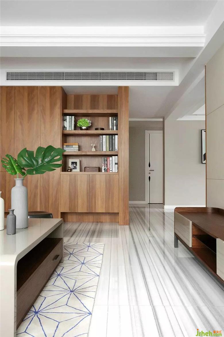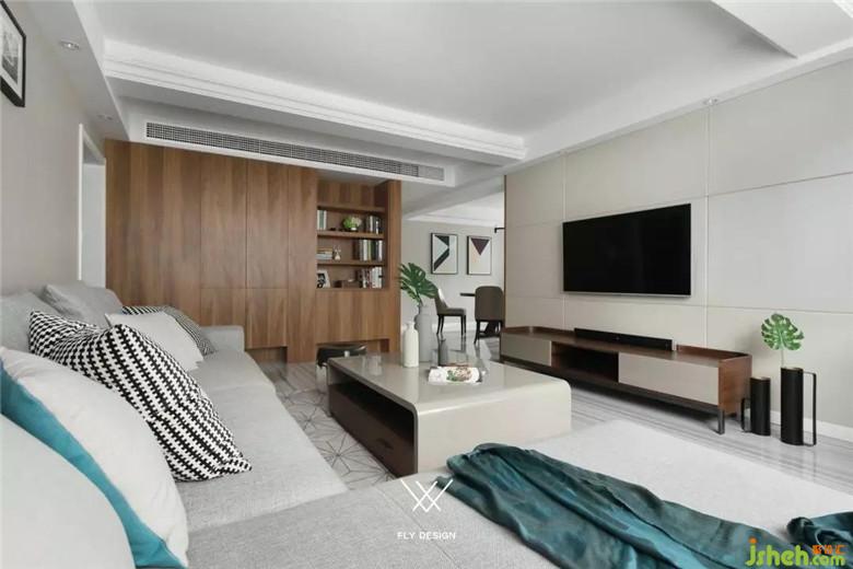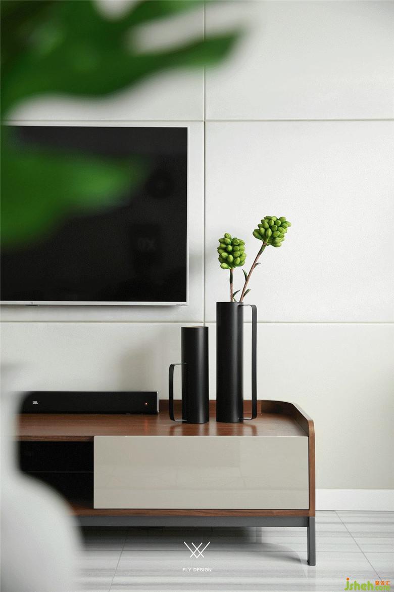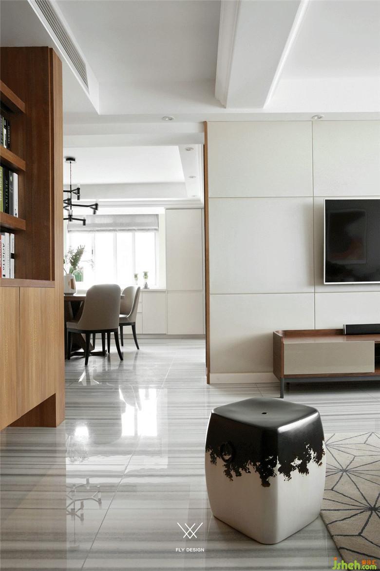 电视背景墙是大块面的黑白色搭配,装修公司使客厅强烈的对比兼具了视觉效果和实用性。白色的烤漆柜门提亮整个客厅区域,收纳空间也足够。下方欧式风格的柜子将插座隐藏在里面,也可以做路由器或机顶盒的收纳,保证了电视背景墙简洁,完整的视觉效果。沙发旁的木制书架,线条简约流畅。