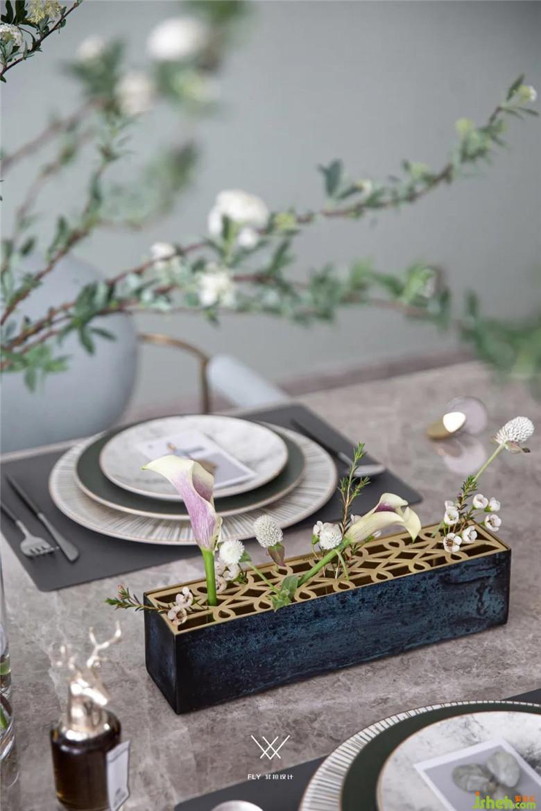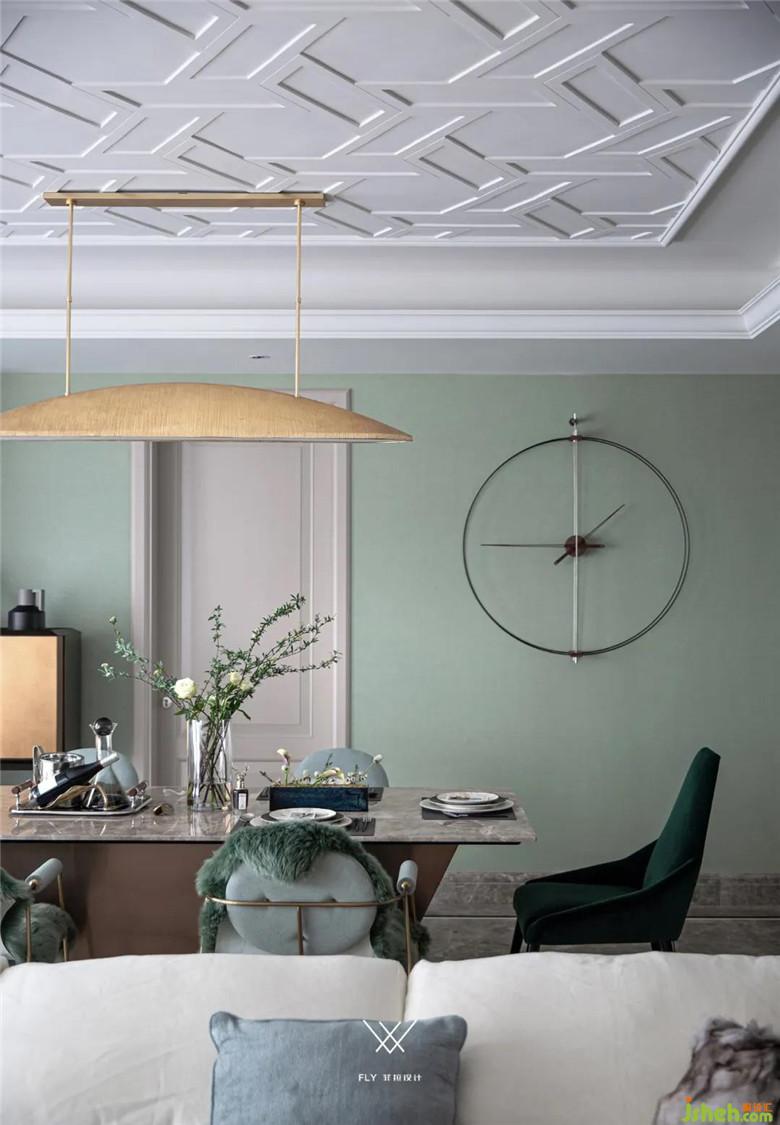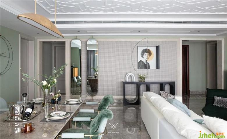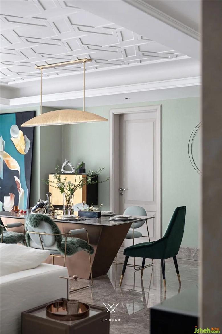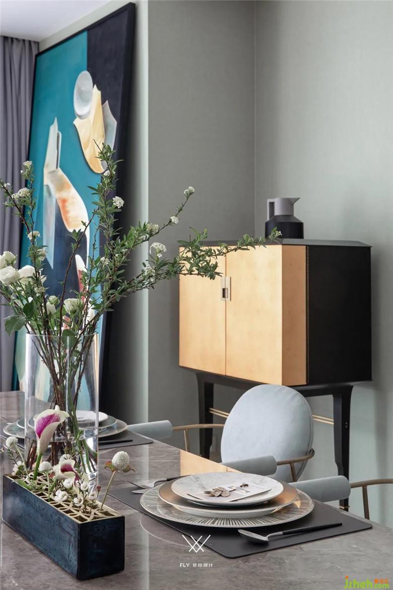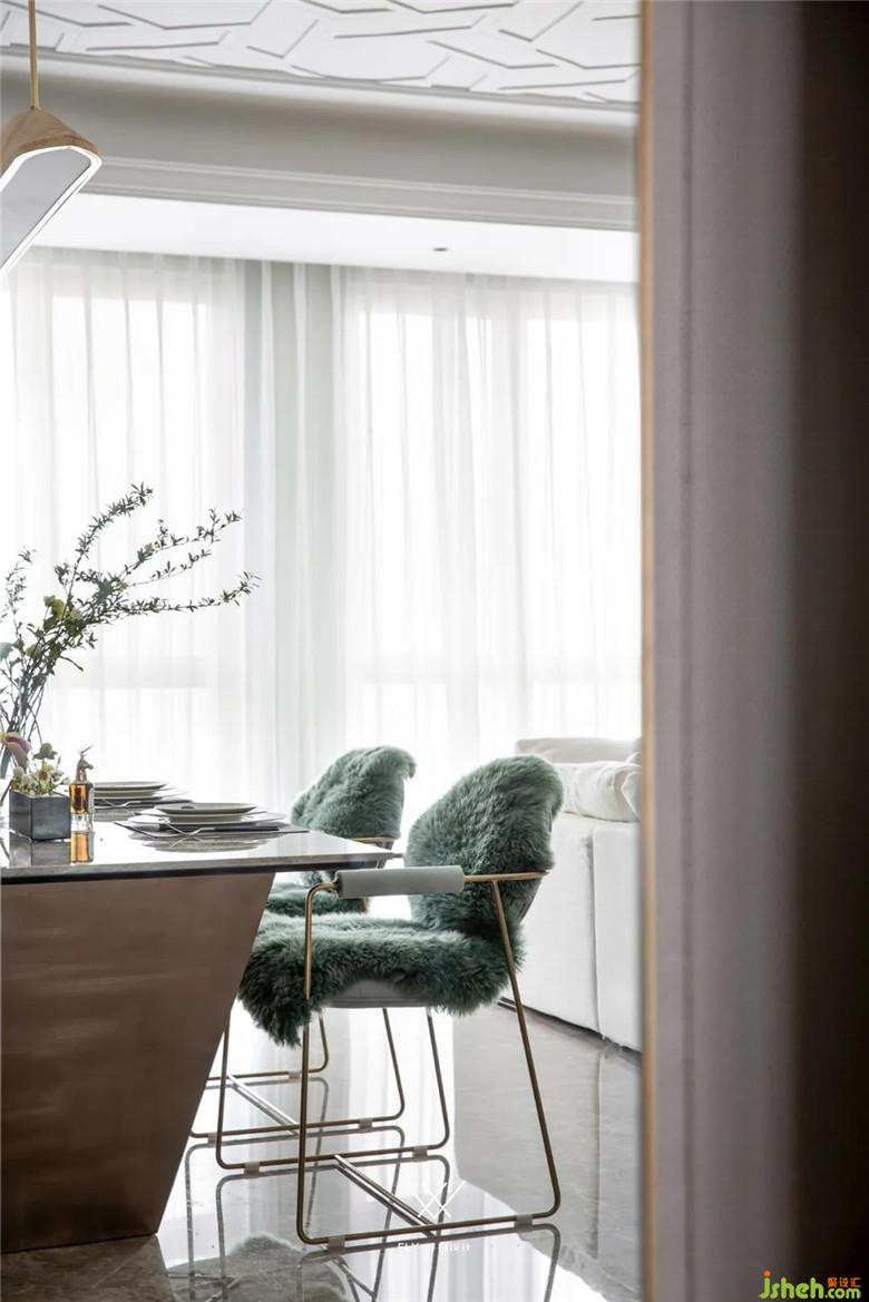 餐厅这里的吊灯原本就存在,而且业主喜欢这个吊灯的金属色泽,所以装修公司没有把它进行更换而是选择同样质感的高脚酒柜和餐椅相配合,能够更好统一。