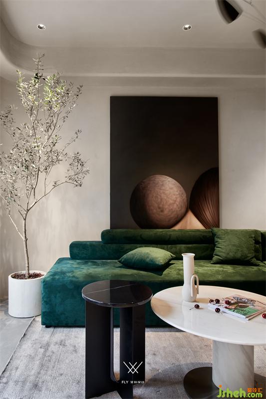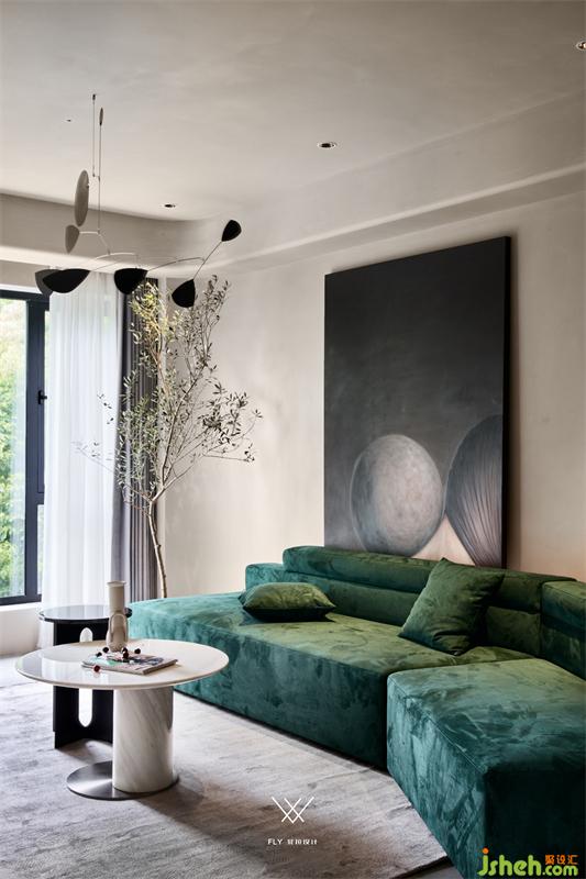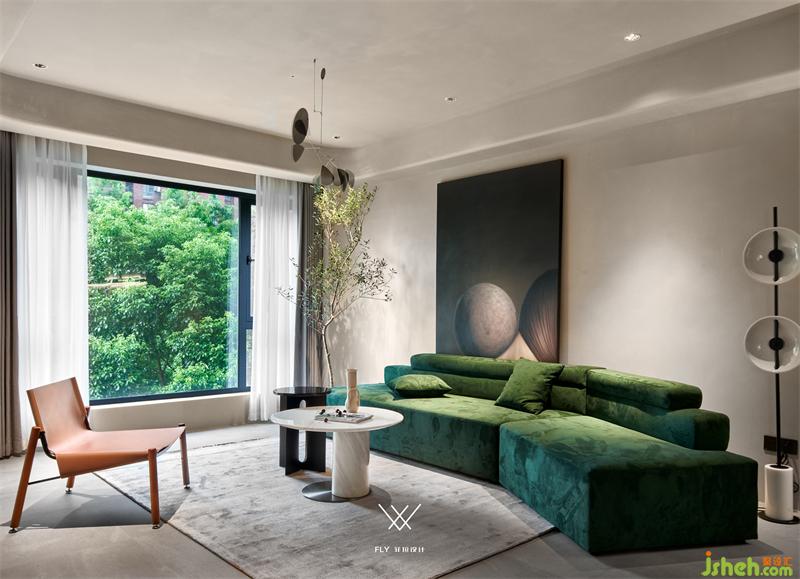 Integration of space integration, roaming and interaction of breath, green outside the window of the room, the color of the sofa, the surface of the material, and light dancing, shadow mottled, painting is also painting.
