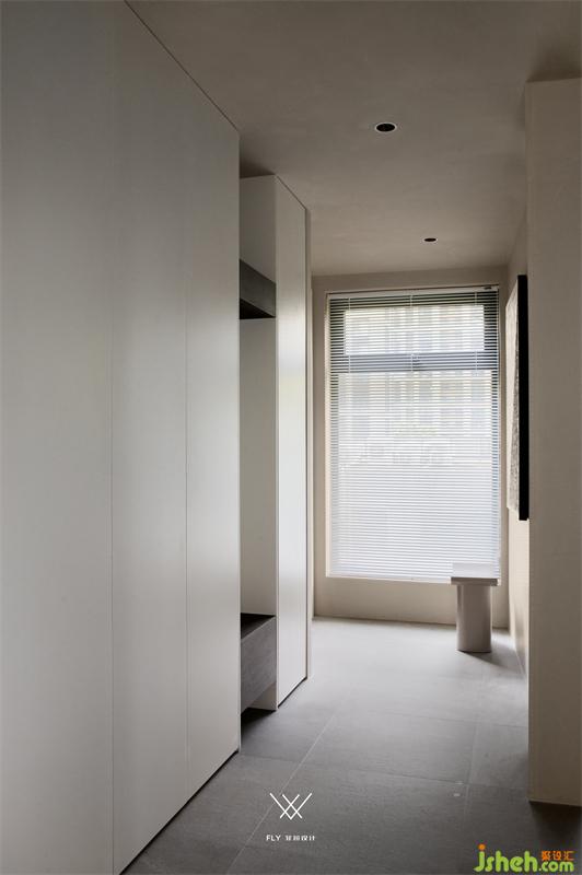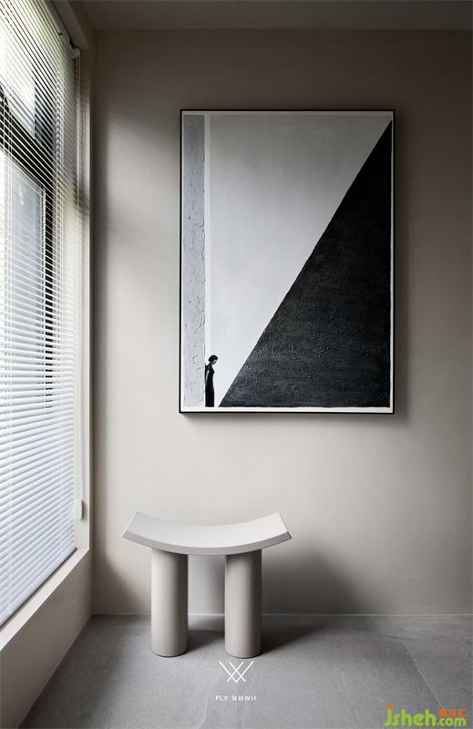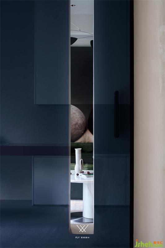 入户廊道与厨房之间隔墙,一体两个立面形成小V角,以微调的隐晦手法扩展廊道,不限于入户端景的局部处理,更是关照几尺廊道的入户感受,趣味传达开阔通透,玻璃隔断显露的厨房配色与比例分割,看似无意识的装饰巧合,不乏殚精竭虑的自然手法填充空间情绪。