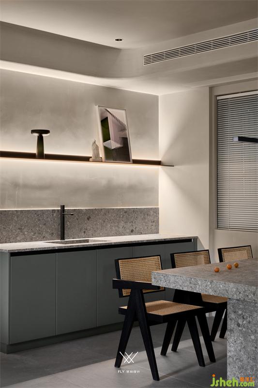 自白立体、结构的交接,书房开放式呈现对话过渡,亦外亦里、亦静亦动,细部的探究触及,立面凹凸感、层次与渐进、光的亮度与阴影神秘多变的姿态创造,材料肌理的表达变化见著于光之中。