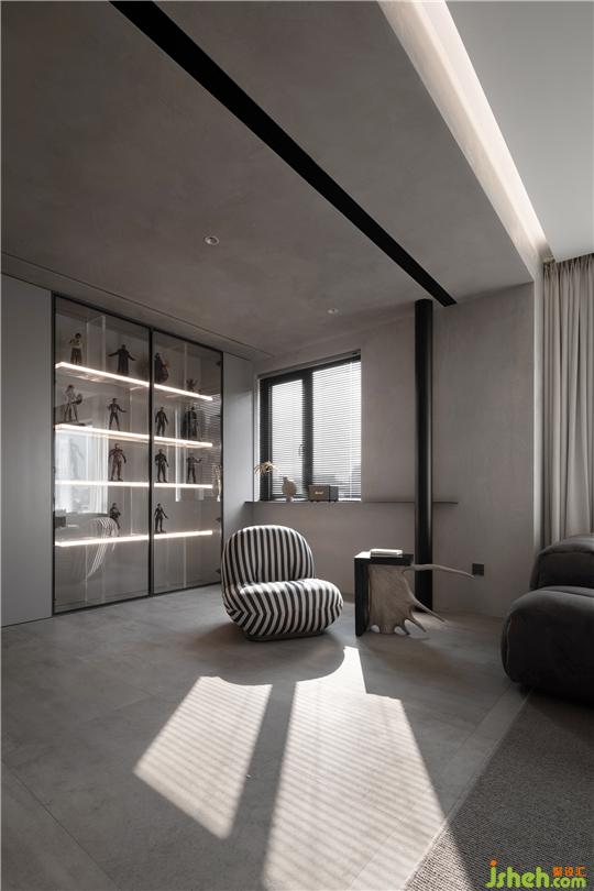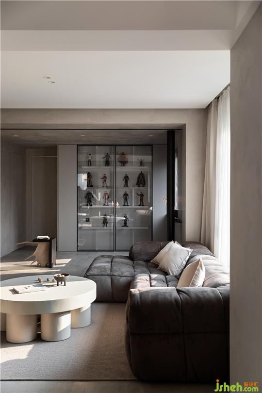 杭州家居设计师将原本狭小的卧室,打通纳入客厅区域,作为休闲区以及业主手办的展示区,让整体空间更加的开阔通透。当室外光线透过玻璃窗进入室内,光与影在纹理之间的凹凸缝隙彼此交织,讲述一个有温度的居住空间。简约的家具之间保持着彬彬有礼的距离,极致舒适的画面贯穿每一个空间,让每一件物品彰显艺术陈列的视觉。