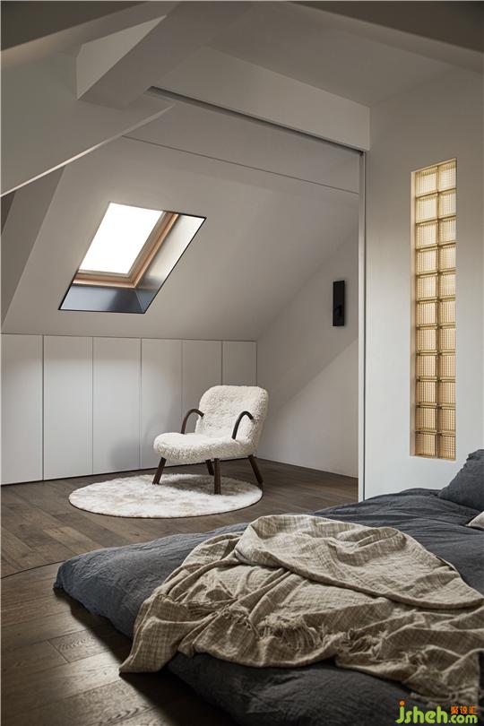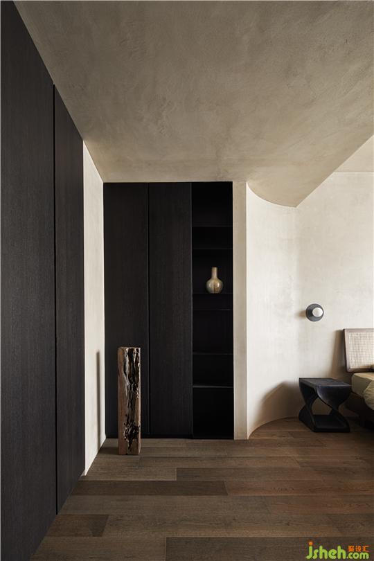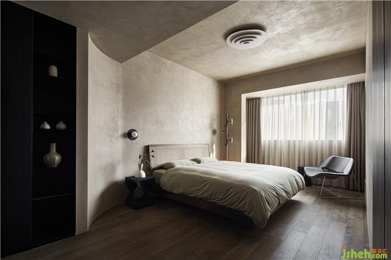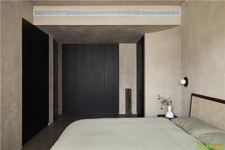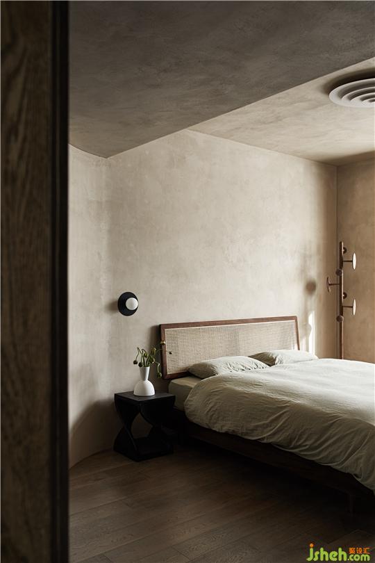 卧室主打暖色调,选用偏黄色艺术漆营造老房子土墙效果,没有冗赘的装饰,归还纯粹的睡眠空间。杭州家居设计重组空间结构,柜体推入墙体,墙面延伸曲面连至衣柜,空间衔接顺畅干净。