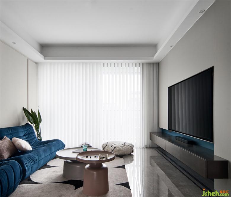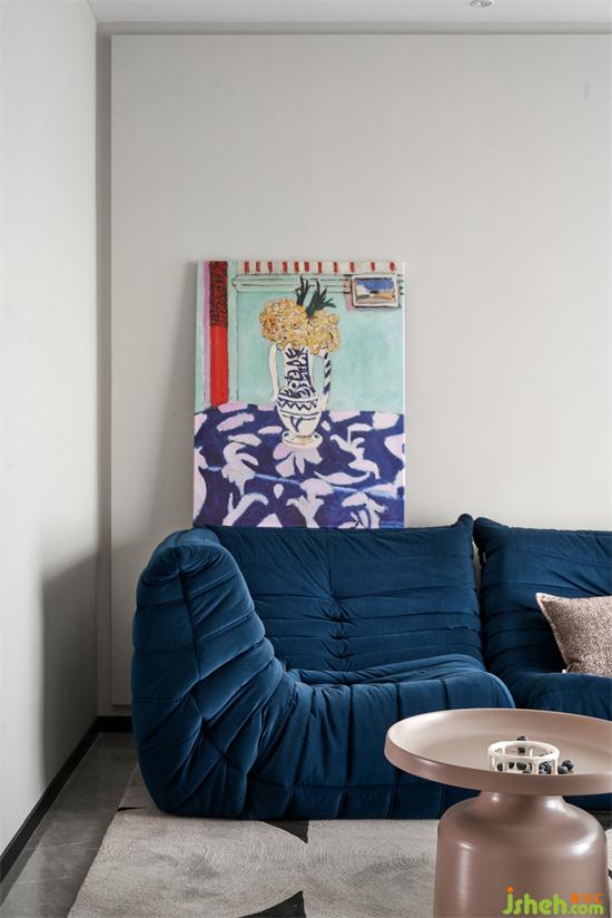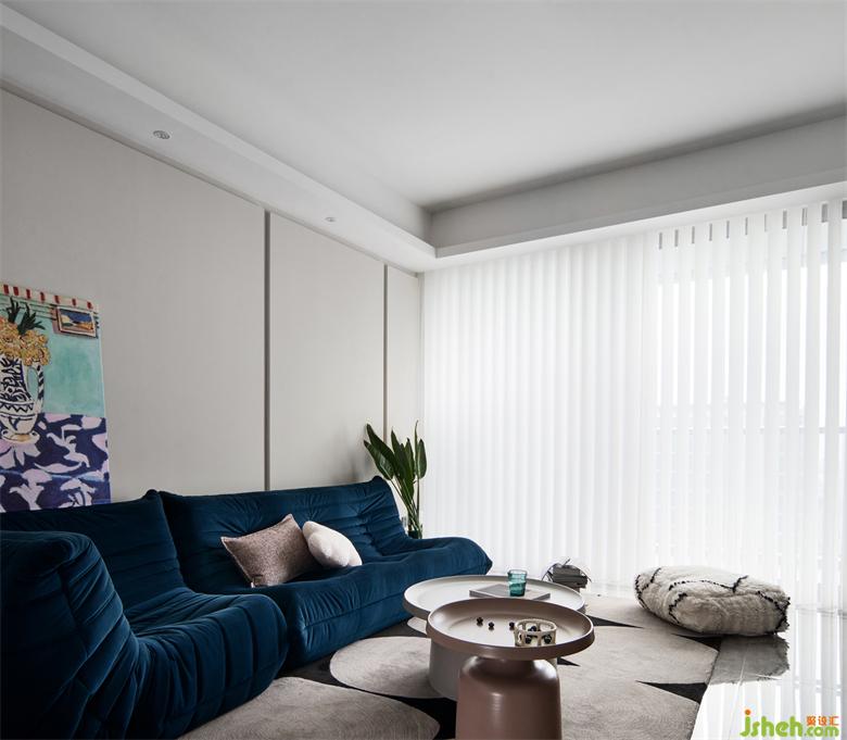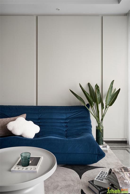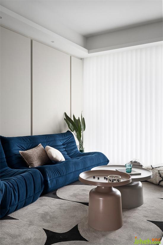 蓝色褶皱沙发搭配造型可观的地毯茶几清浅温柔的空间倒也散发着慵懒俊逸的精装房改造气息