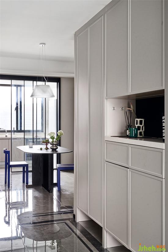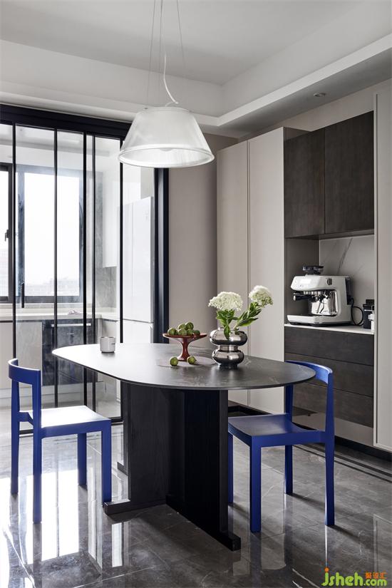 一侧立餐边柜强化餐厨收纳所需柔化的灰白黑空间加精装房改造入克莱因蓝