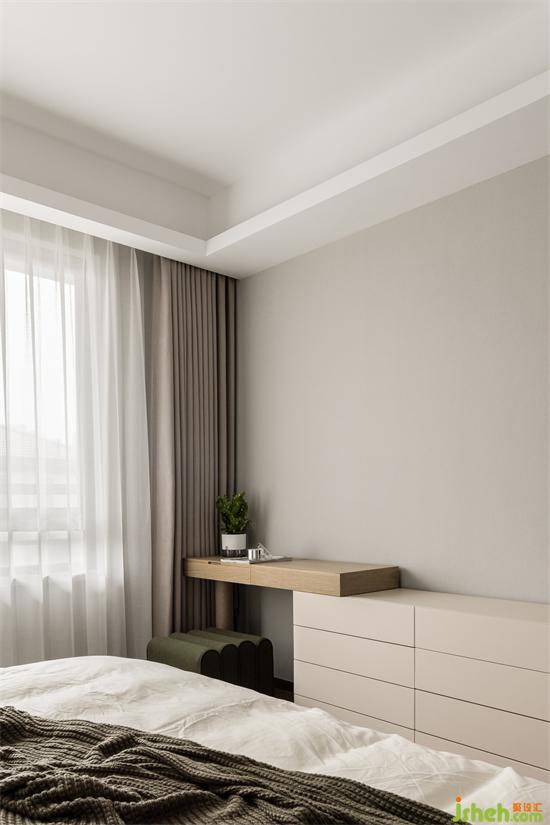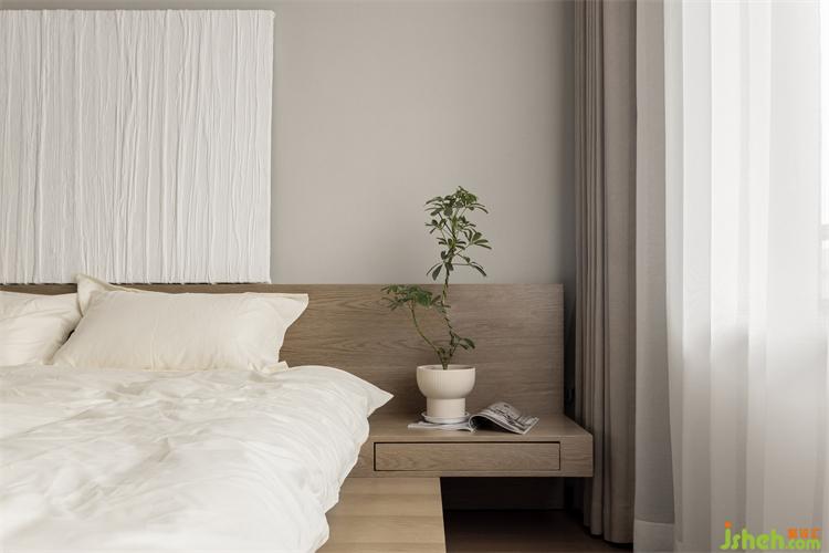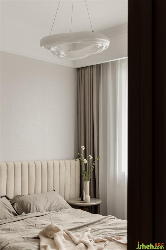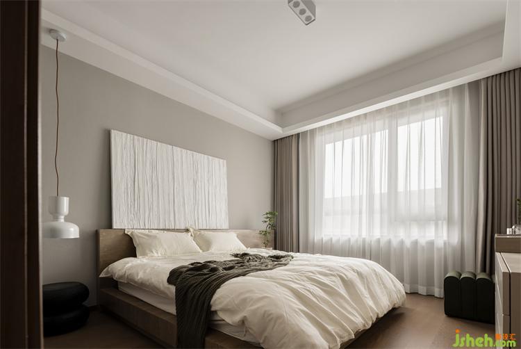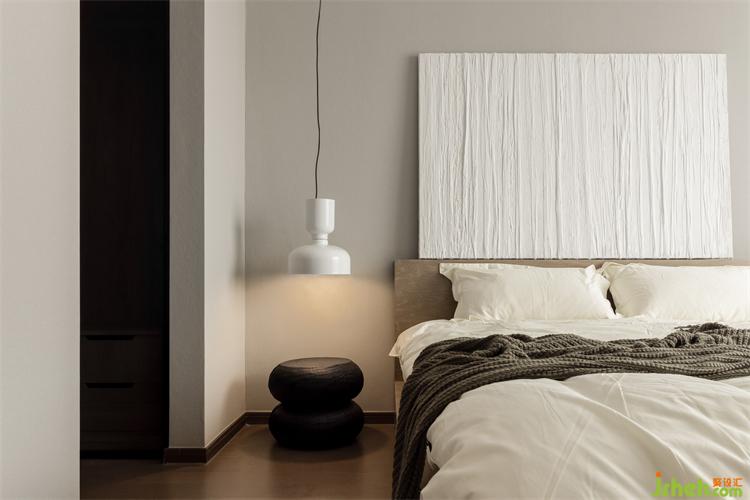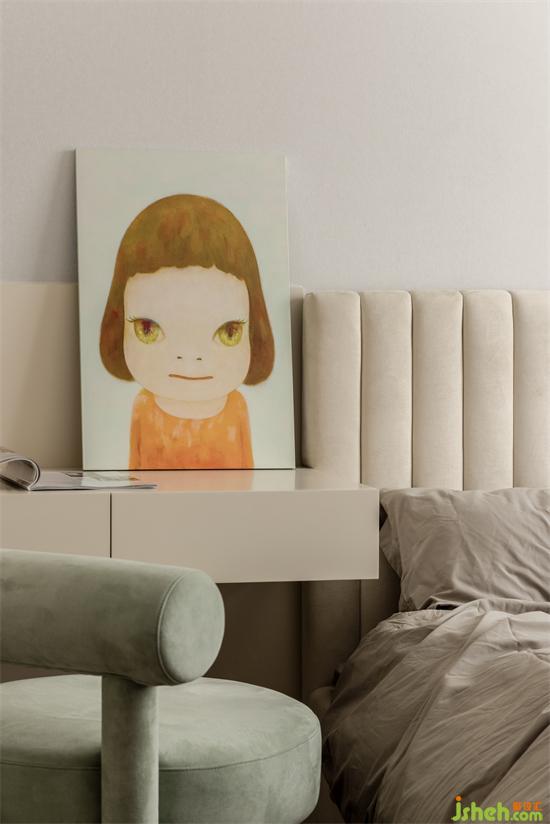 主卧的床头背景装饰画为屋主亲手所绘,禅意不失优雅,杭州上坤山语四季装修设计颇有几分行至水穷处,坐看云起时的闲适之感。