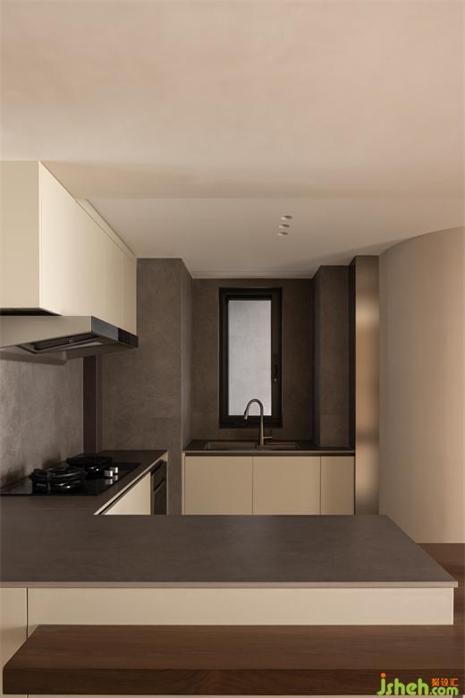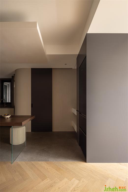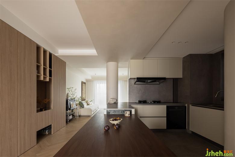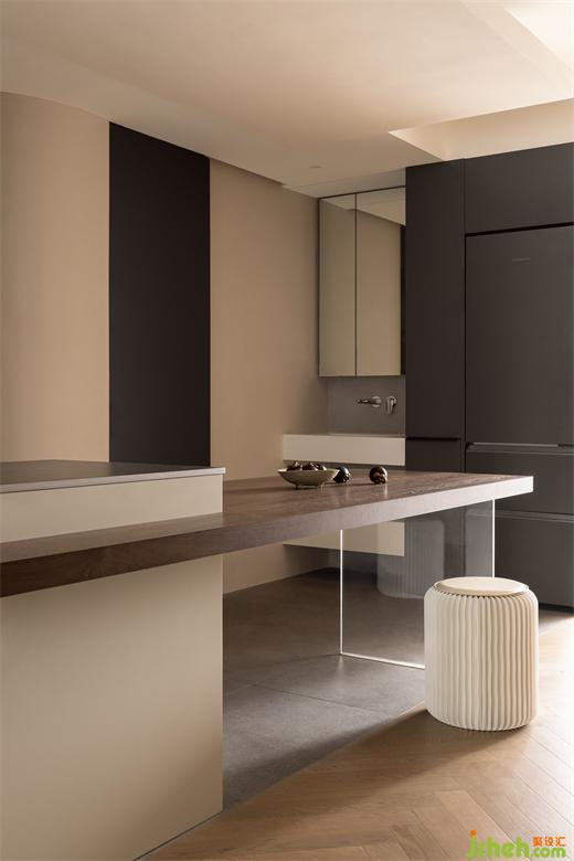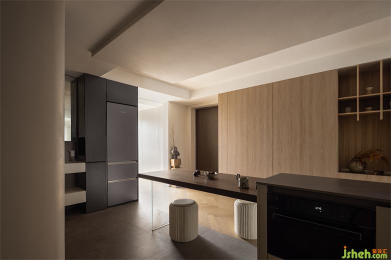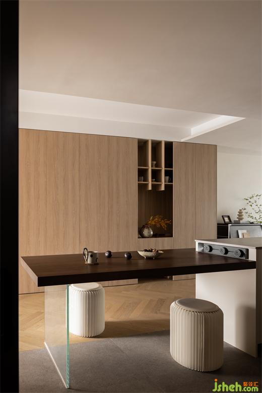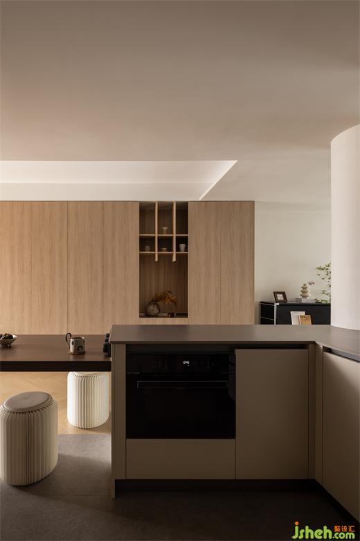 Considering the residents' lifestyle and smooth spatial flow, the functional area is integrated with an open kitchen and island dining area. With the unrestricted boundaries of the space, the self-sufficiency of the area comes from implicit element expression, and the ground and top materials and block surfaces are spliced and transitioned. The corner of the island is replaced by a cylindrical shape, creating the order of the space and the atmosphere under the area.