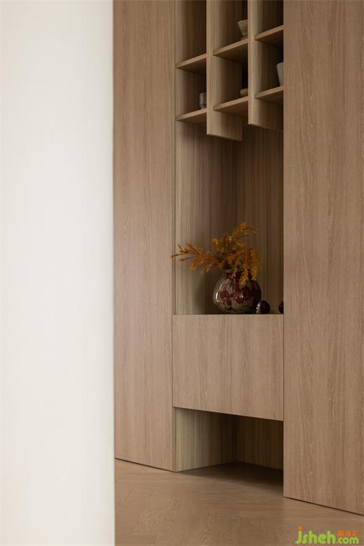 在区域功能的落笔下并述空间的连贯性,功能间的过渡自然和谐,将机能感与艺术感糅合其中。餐厨区与一侧餐边柜在保有功能归置的前提下,留意其整体的尺度感,细部造型的丰富与跳跃,给予大面积平铺元素呼吸感。