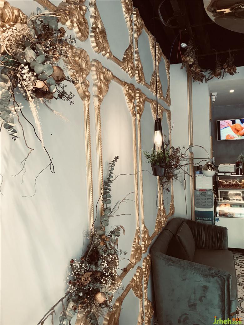 墙身金色的石膏造型,一进门就觉得店内很金碧辉煌,感觉就像进了宫廷那样。地面的花纹砖与墙身的石膏造型的反差对比,加上植物花的装饰摆放,恰恰可以充分营造出整体空间的氛围。