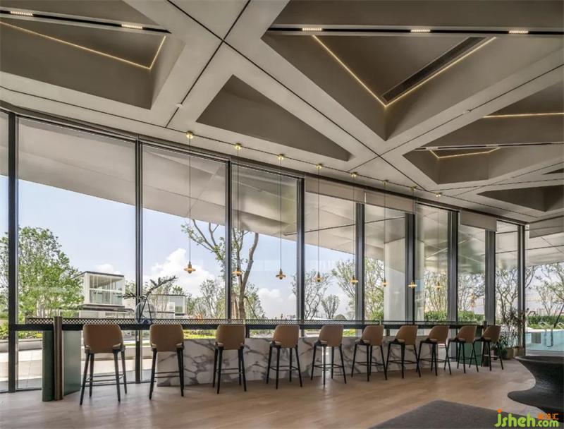 吧台区通透的落地窗将室外美景揽入室内,条形长桌更是为年轻潮人提供了交流讨论的平台。