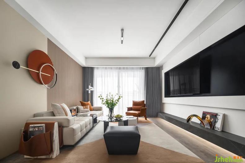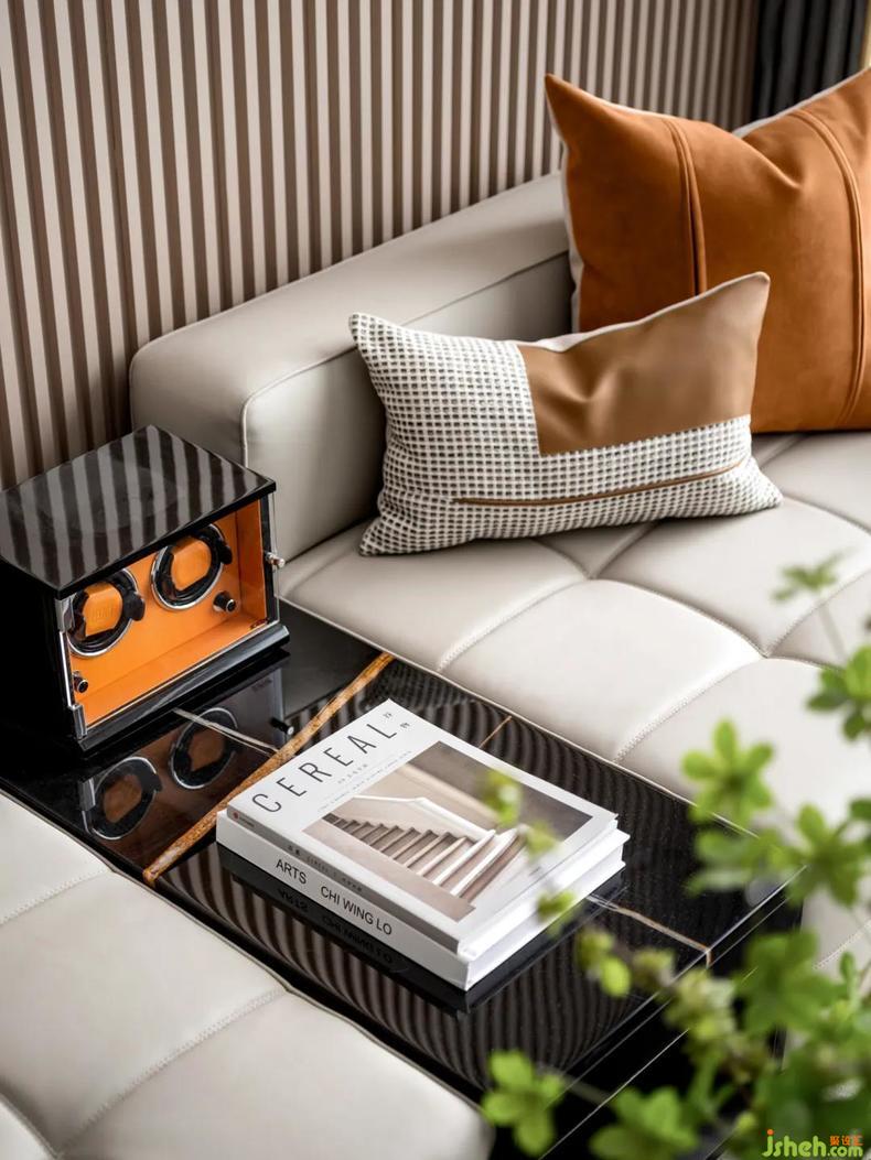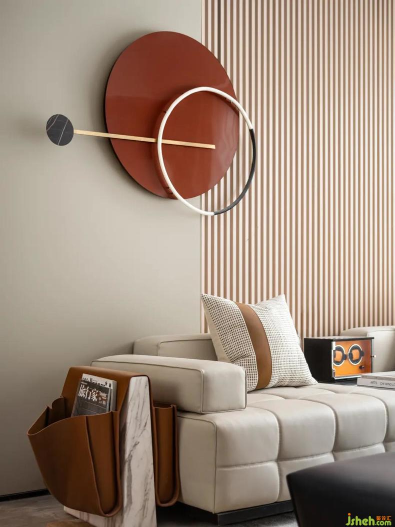 在客厅中,色块拼接的浅咖地毯和木板地面搭配,灰白的沙发上跳跃着暖棕的皮革抱枕,深沉的黑色小客桌于地毯上协调呼应,勾勒出淡淡的秋意。倚靠的墙壁时钟装饰提升空间创意调性,凸显对男主人生活的独特见解,不追求浮夸矫饰,构造出一种精致及至精神张力的场域境界。