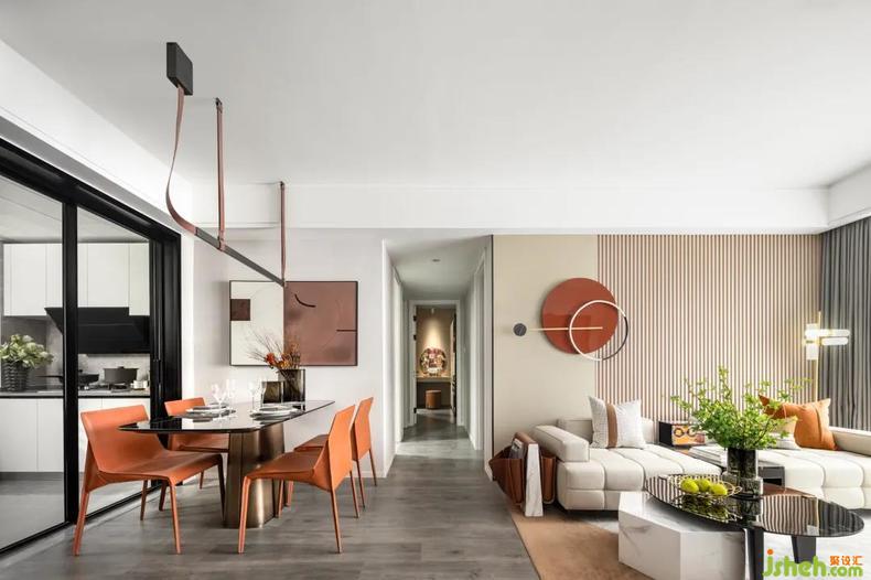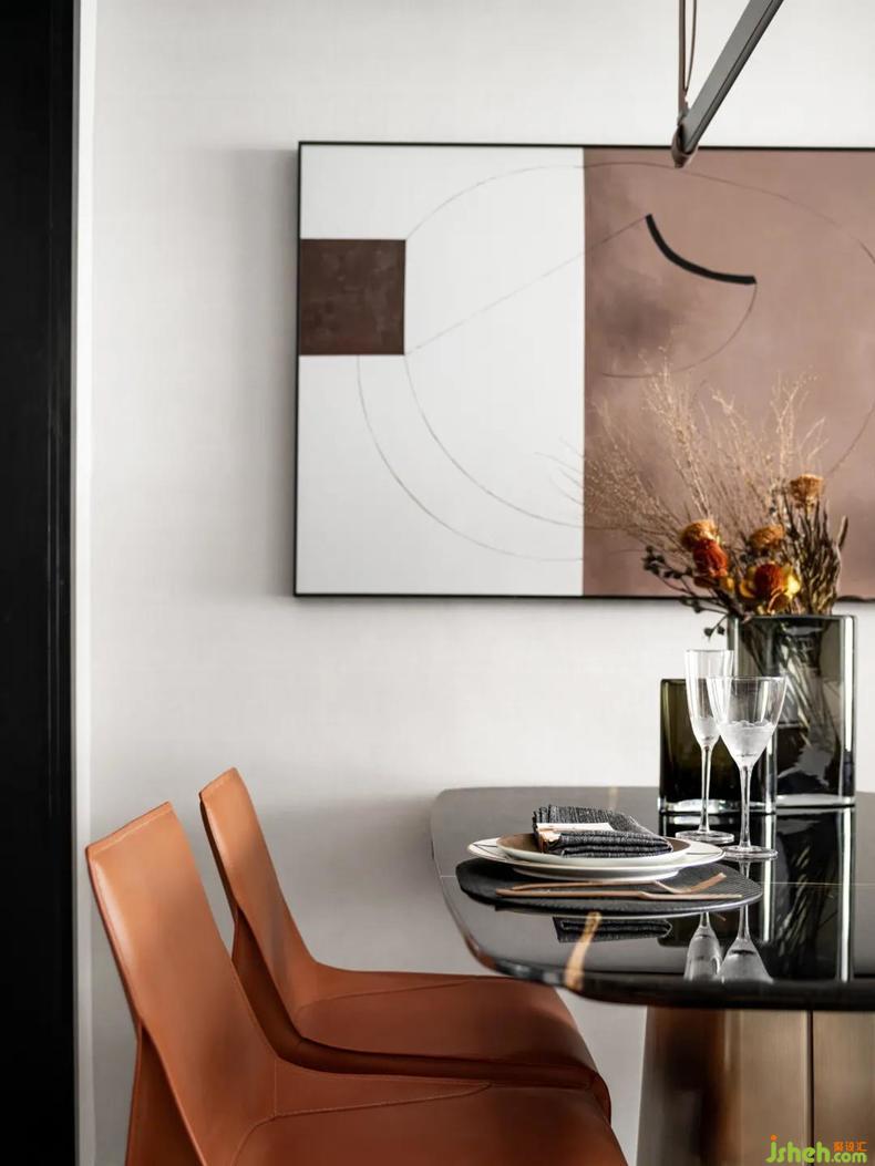 在一片淡雅的基调中,各种配饰的组合营造温馨浪漫的生活场景样板房设计。开放式餐厅衔接着厨房和客厅,皮制的餐椅与玻璃的餐桌台面融合得恰到好处,暖调的分布透露着独立而又互相连接,是色彩与材质的完美演绎,是触感与观感的双重碰撞。
