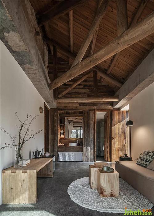 室内空间的设计灵感,源自于“侘寂(wabi-sabi)”以接受短暂和不完美为核心的日式美学艺术。海力设计团队希望保留建筑古旧时代感的同时,去融入现代艺术的技艺,打造一种“虽由人造,却宛若天成。”的人与自然、建筑与室内、融为一体的美学空间。使得建筑与室内空间,更有向传统回归的价值取向,更让人在自然中,想起小时候故乡的情怀。民宿装修