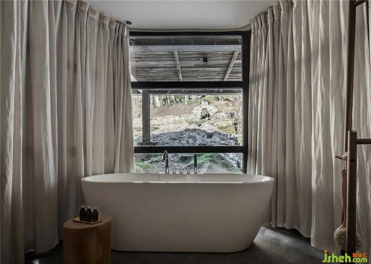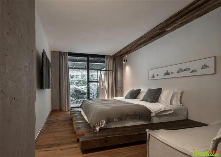 卧室空间极具乡野韵味的床具旁,搭配着空间内棉麻质感陈设,当自然的风透过景观台吹拂而过时,空间更为空灵纯粹,涌动着欣然舒惬的情感。