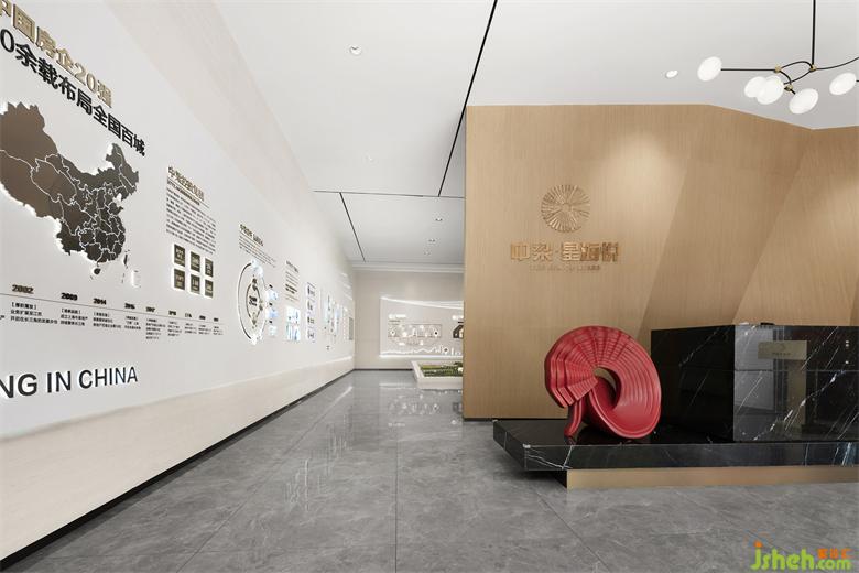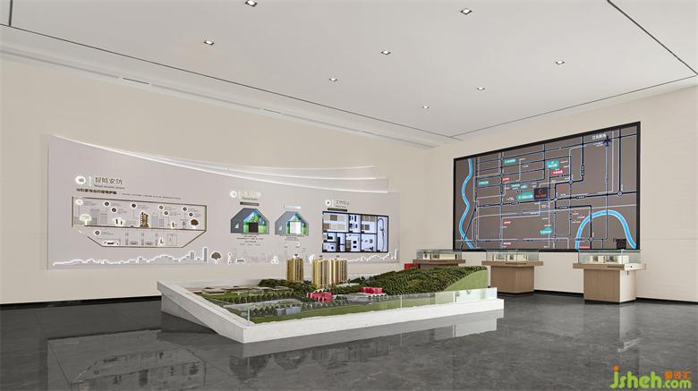 沙盘区及企业文风采区,空间形态上,以现代建筑形态为切入点,结合点、线、面构成空间体块,营造连续流畅的空间体验感,挖掘人的空间感受,寻找与自然触动人心的互动交流。