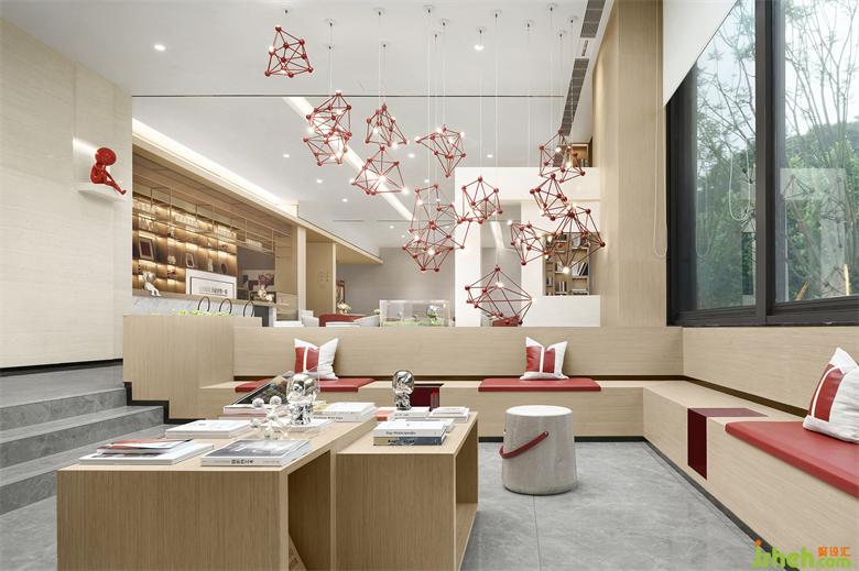 下沉式图书区,结合重庆网红书店,钟书阁、南之山、精典书店山、时光里独立书店……网红元素,让中国红的延续至此,创造轻松自由的落座空间,让人们可以舒适的停留下来,信手拾起的书。