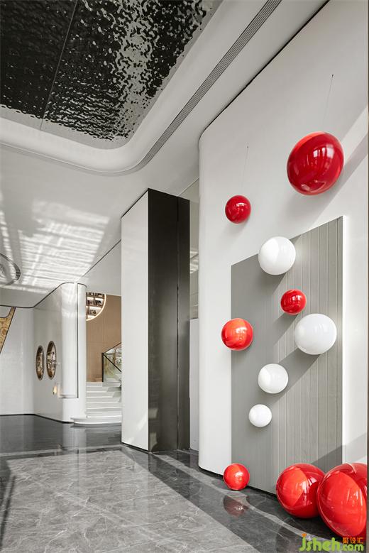 遵循营销需求,打造童梦主题空间。受建筑设计语言启发,结合时尚元素,色彩亮丽阳光。很好暗合本案传达的精神内核。给客户新颖、阳光、时尚的空间体验。硬装以灰白色为主,软装配合硬装空间,点缀以红色、金色。