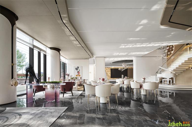 空间布局随着建筑塑造的形态而展开,结合功能与需求,空间设计充分利用玻璃幕墙,对室外景观不做任何遮挡,塑造人与自然、光景、与室内的关联互动。