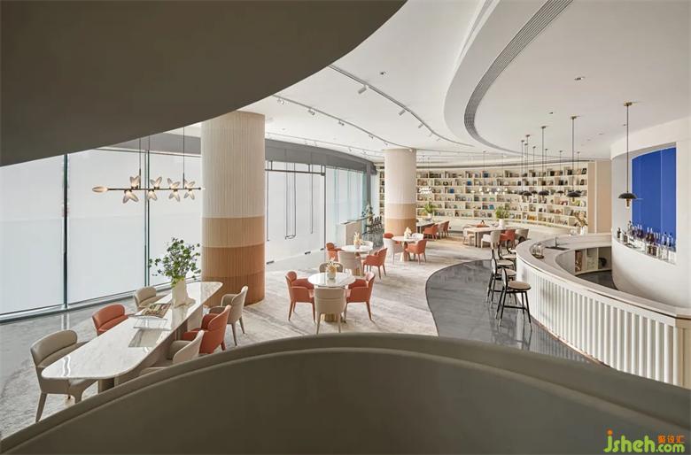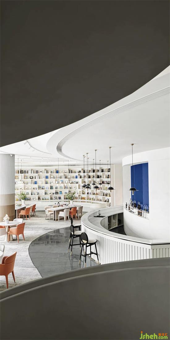在负一楼清吧区域,色彩会更加的年轻活跃。随意可落座的蜿蜒阶梯书吧,配合不同形式的洽谈桌椅,重庆售楼处设计营造出丰富的空间层次,充满质感的皮革,纯净的花艺与绿植,在开阔的空间内形成平衡量感,充满自然与现代文明的和谐秩序之美。