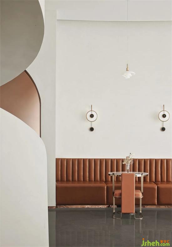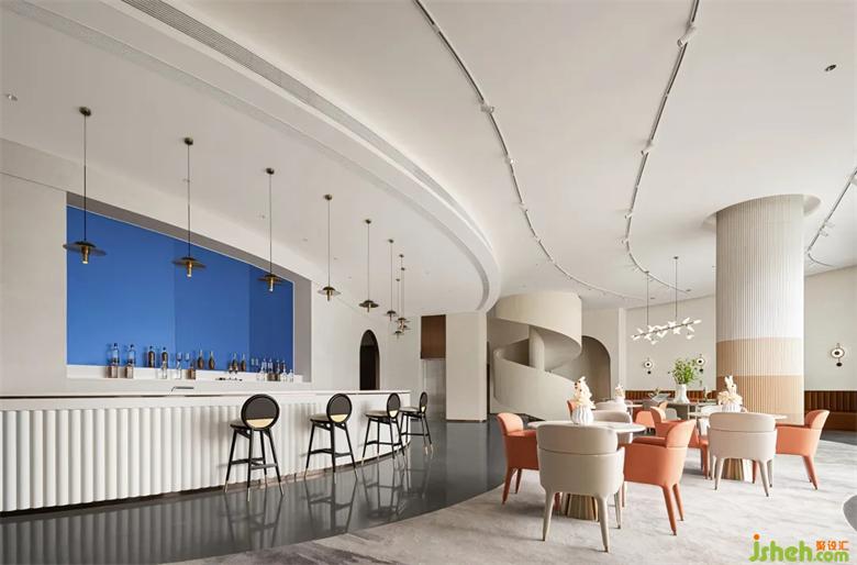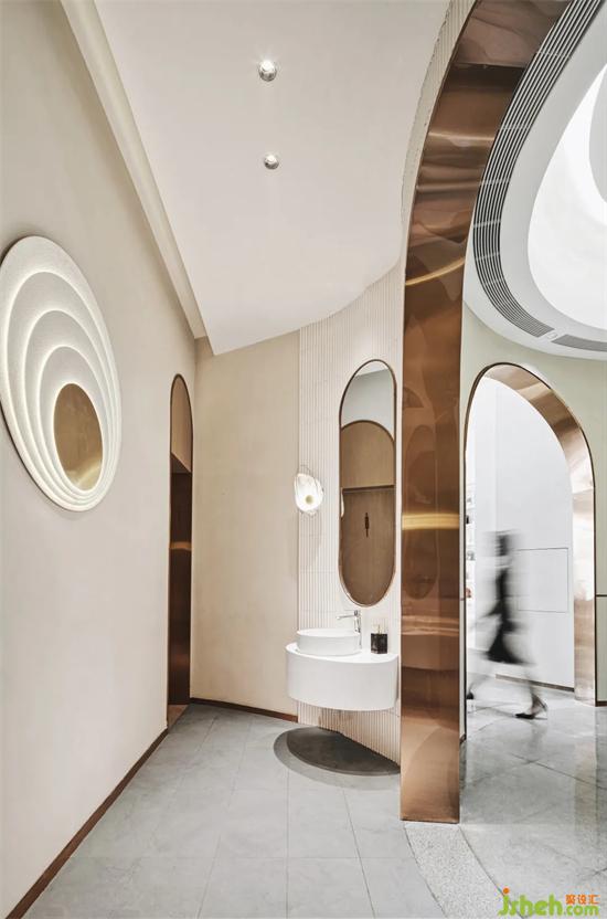 如同从墙面悄然长出来一般的吧台区,和建筑的生长异曲同工,利用材质本色与重新编排所呈现的肌理,重庆售楼处设计将抽象的语汇记叙在这座建筑轮廓里。一层层迭代的浪花天顶的处理,蜿蜒优雅,延续无尽的“春意”,通过空间与人的互动产生新的碰撞。