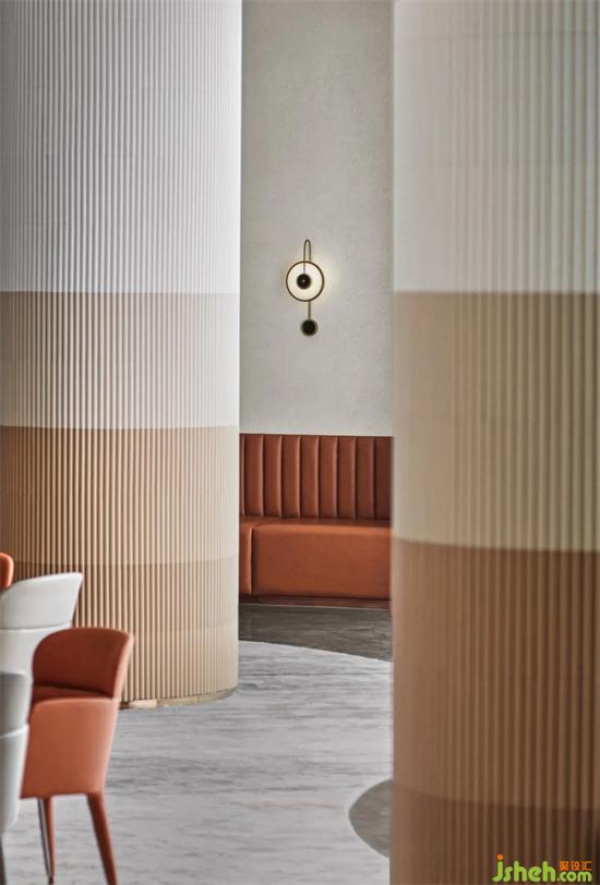 立柱的渐变处理,利用小石材的竖向拼接,重庆售楼处设计将竖向阵列元素延续到底。宛如中国画般,时而流动,时而聚集,创造更趣味的空间体验。
