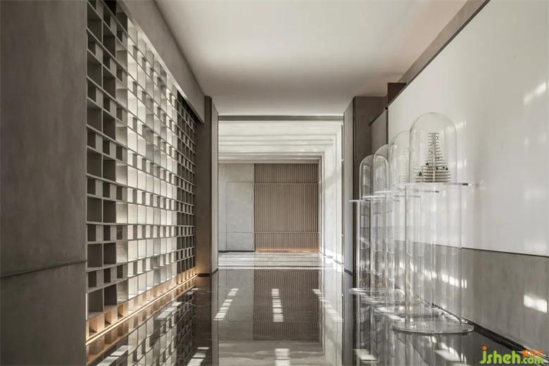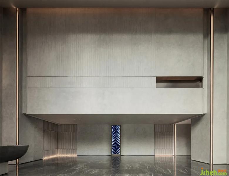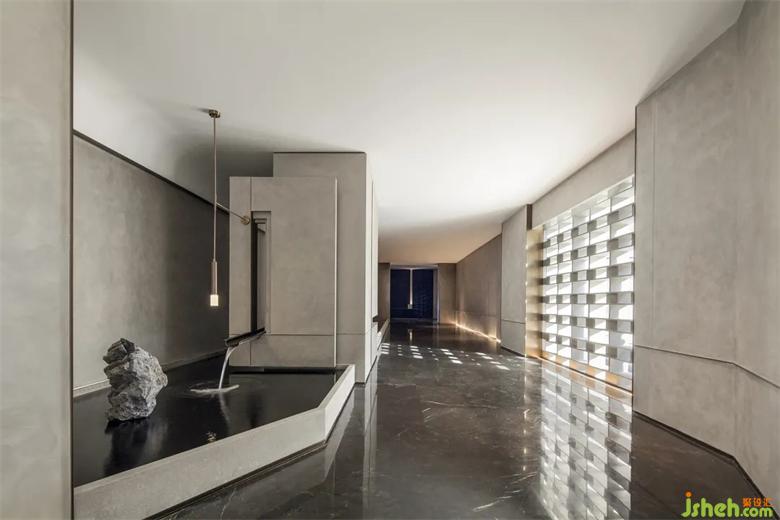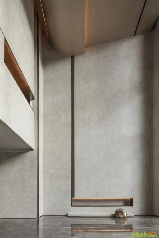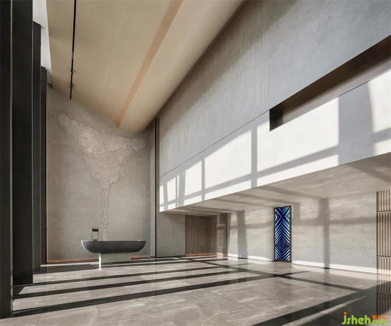 超高挑空塑造了入口处的厚重气势,精细雕琢的细节与体块变化,也让空间更为灵动。会所设计石与景的穿插,引室外景色到室内,内外形态的蔓延,牵引着入室者的视觉体验。